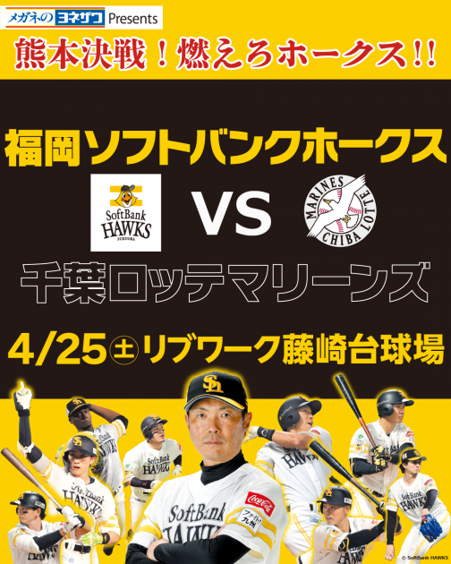 | 概要 | 熊本決戦!燃えろ、ホークス!! 2026年4月25日(土)、リブワーク藤崎台球場にて小久保裕紀監督率いる福岡ソフトバンクホークスと千葉ロッテマリーンズが対戦します。 2025年シーズン、5年ぶりの日本一を果たした福岡ソフトバンクホークス。 |