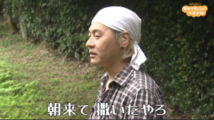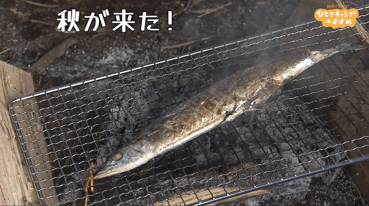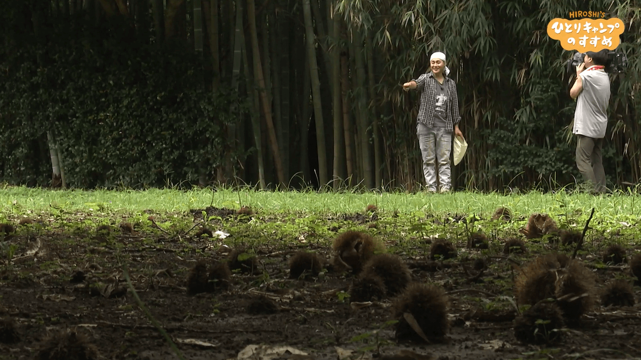 山に自生する栗を拾って食べ比べ。さらに、秋刀魚を炭火で焼いて食すヒロシ。