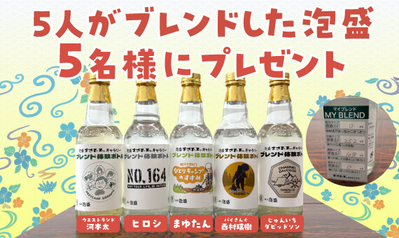出演者(+まゆたん)が一人一人ブレンドしたオリジナル泡盛を5名様にプレゼント 「まゆたんブレンド・ヒロシブレンド・西村ブレンド・じゅんダビブレンド・河本ブレンド」のどれかからお選びください。 ※プレゼントは1人1本です。