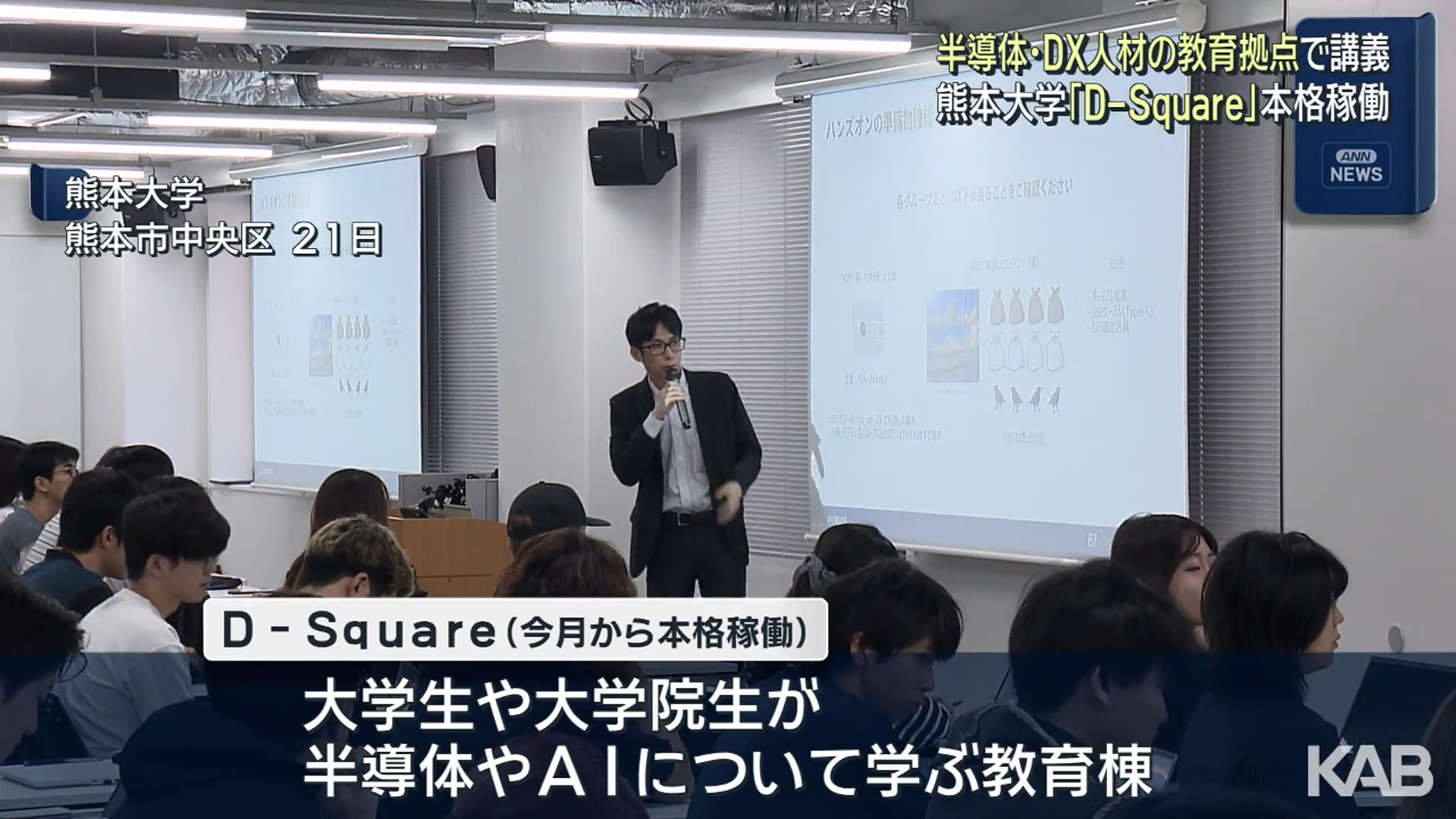 熊本大学の半導体やデジタル分野の人材を育成する教育拠点「D‐Square」で、今週初めての講義がありました。 「D‐Square」は、大学生や大学院生が半導体やAIの使い方などを学ぶための6階建ての教育棟で、半導体関連企業などから最先端の半導体やAI関連の技術を学び・..