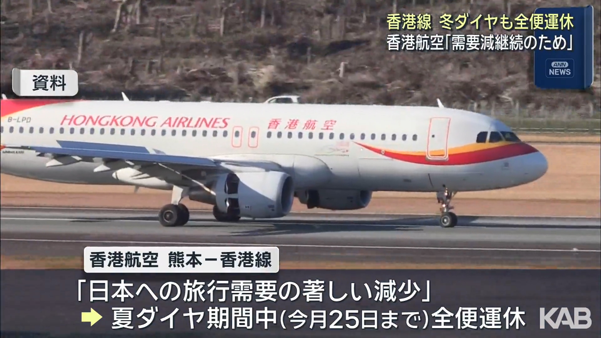 香港航空は、週4便の熊本-香港線について、10月26日から来年3月28日までの冬ダイヤ期間中、全便を運休すると発表しました。 「日本への旅行需要の著しい減少」を理由に、10月25日までの夏ダイヤ期間中、全便を運休していて、冬ダイヤ運休の理由については「需要の著...
