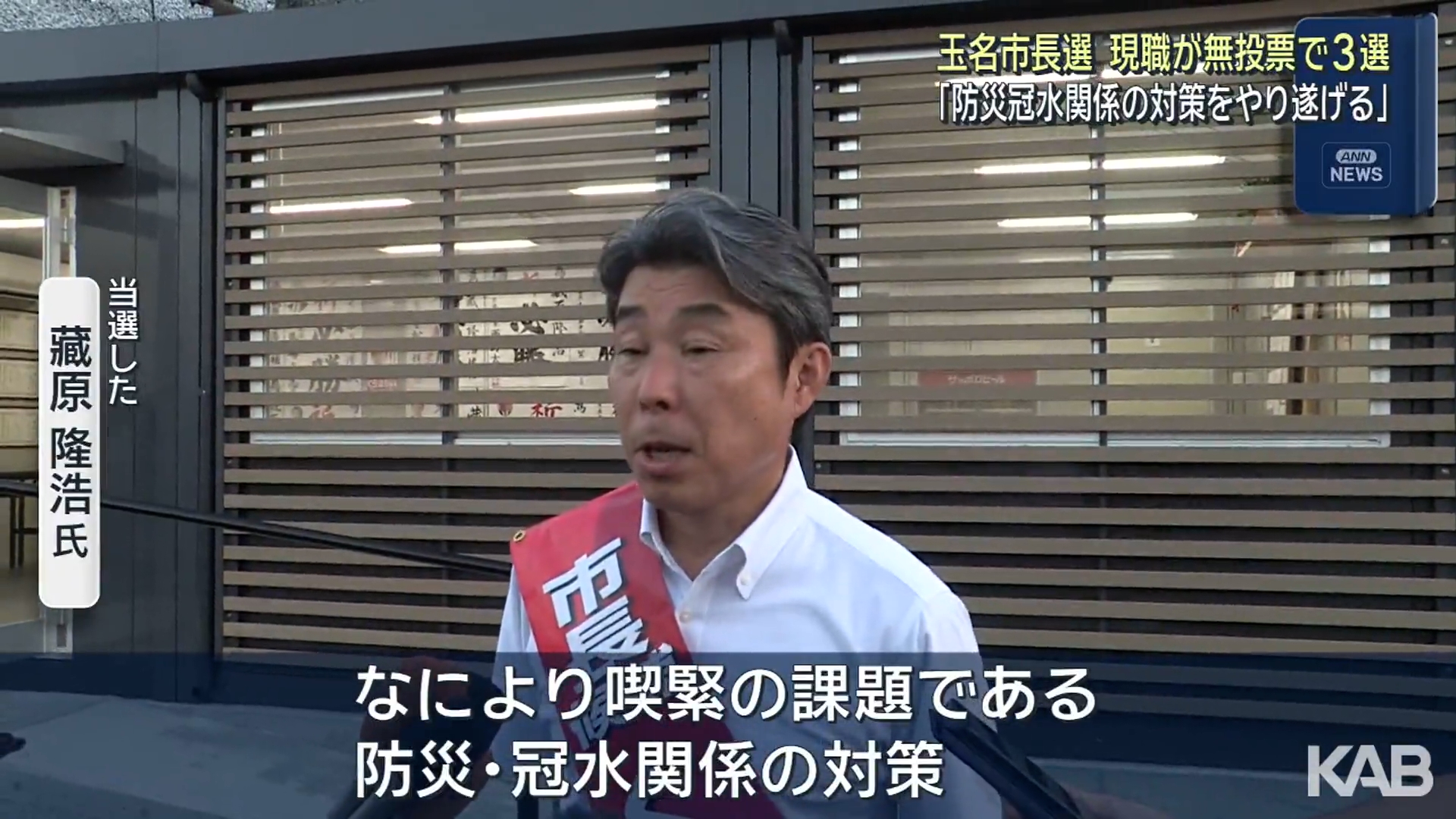 任期満了に伴う熊本県の玉名市長選挙が12日告示され、無投票で現職の蔵原隆浩さんの3回目の当選が決まりました。 蔵原さんは今の熊本学園大学を卒業後、玉名市議などを経て、2017年の市長選で初当選し、現在2期目です。蔵原さん「何より喫緊の課題である防災、冠水関...