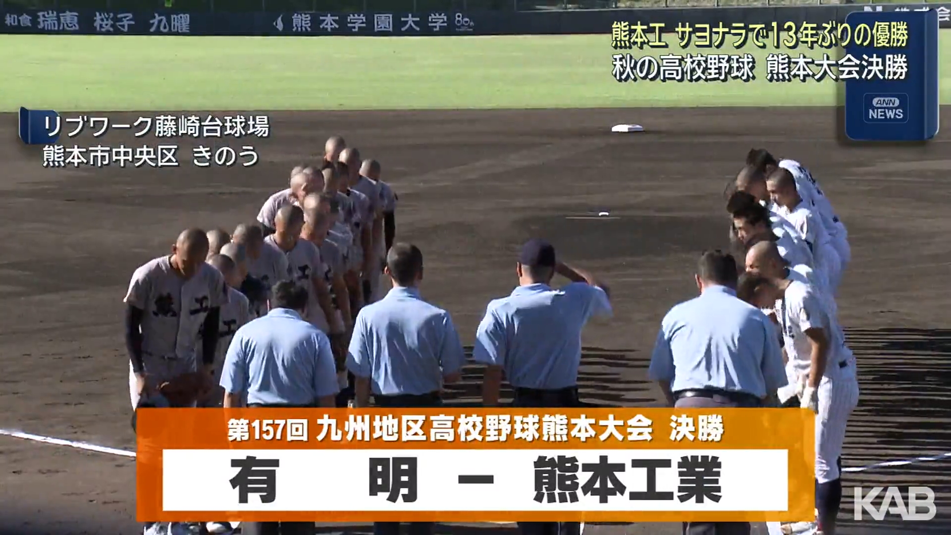 秋の高校野球熊本大会の決勝が行われ、熊本工業が13年ぶりの優勝を飾りました。 決勝は、有明と熊本工業の対戦。両チームのピッチャーが持ち味を発揮します。 有明の工は130キロ台のストレートを武器に、いきなり3者連続三振の立ち上がりを見せると、熊本工業の堤は...