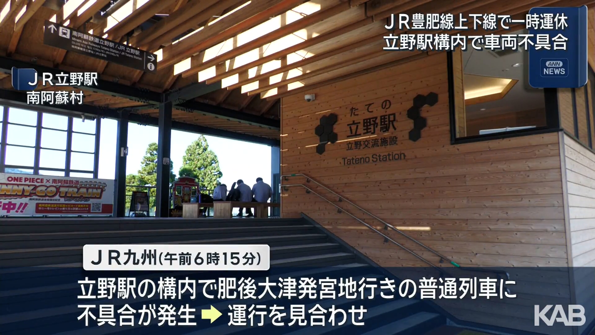 6日朝、JR豊肥線の立野駅で、車両の不具合が発生し、一時、上下線で運行を見合わせました。 JR九州によりますと、6日午前6時15分ごろ、立野駅の構内で、肥後大津発、宮地行きの普通列車に具合が発生し、運行を見合わせました。 午前7時12分に車両の処置を終えて、運...