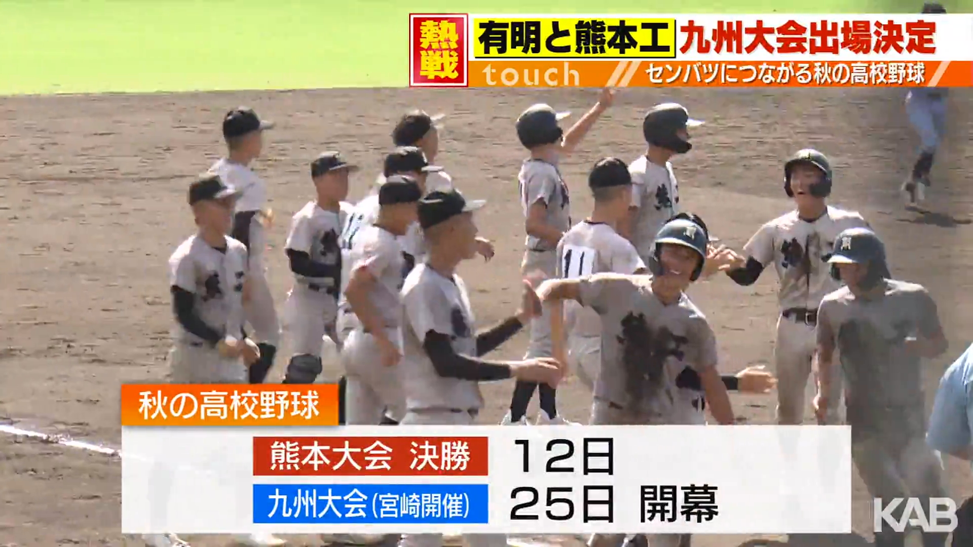 秋の高校野球熊本大会。センバツにつながる九州大会への出場権を有明と熊本工業がつかみました。 準決勝・第一試合は岱志と有明の一戦。3回裏、2アウト2塁で2番・工がセンター前へタイムリーを放ち、先制すると、続く3番キャプテンの實田が、左中間を破るタイムリー2...