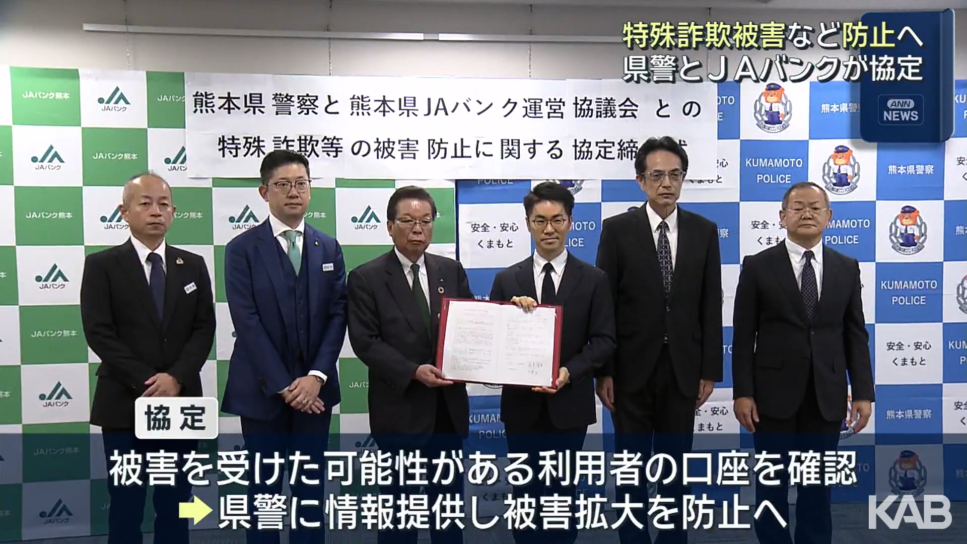 熊本県警と熊本県JAバンク運営協議会が、特殊詐欺などの被害防止に取り組む協定を結びました。 協定は、県内での特殊詐欺被害の増加を受け、締結されました。 県警によると、県内では、今年9月末時点で、電話で「お金」詐欺で7億1600万円、SNS型投資ロマンス詐欺で1...