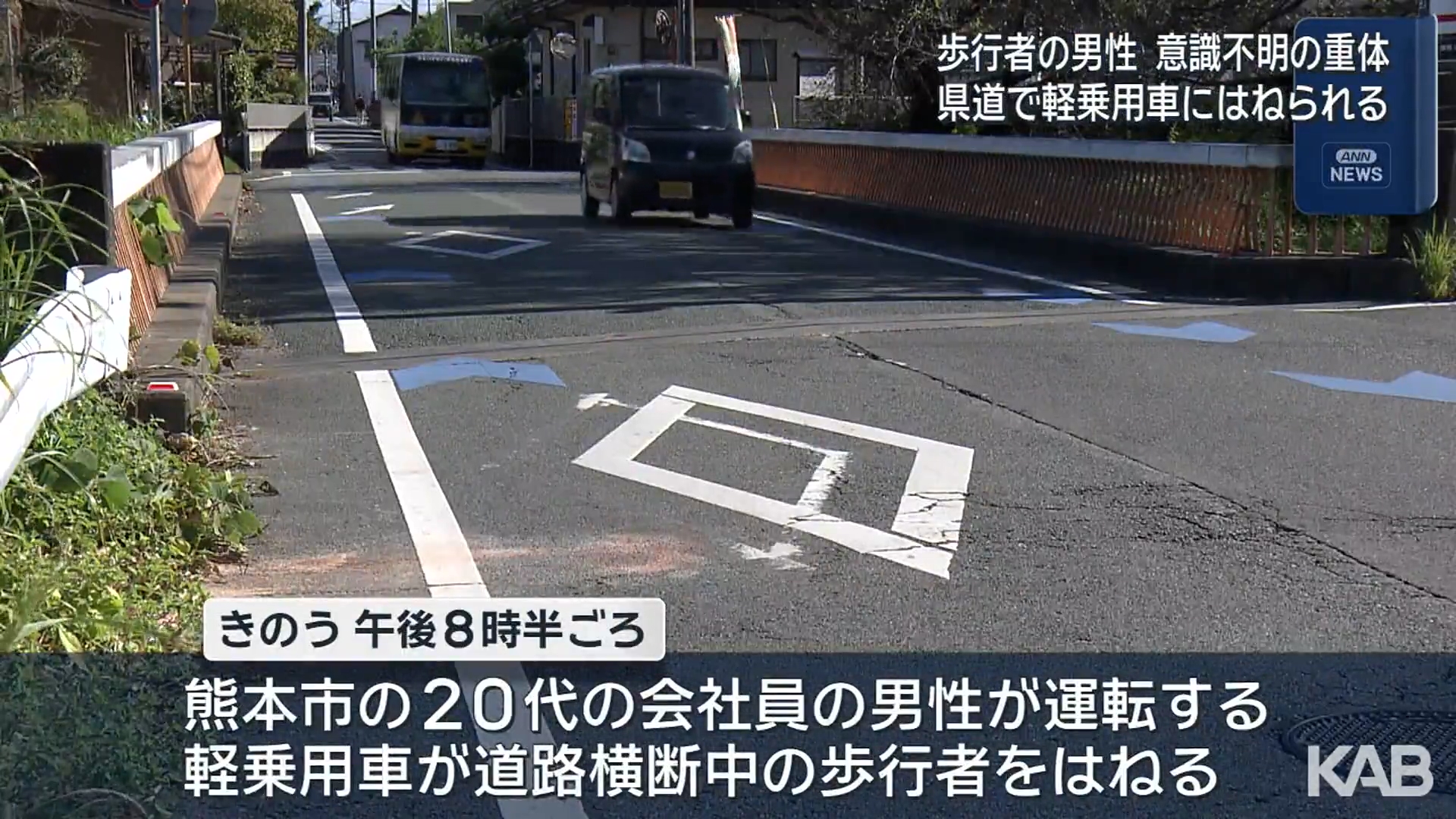 8日夜、熊本市の県道で軽乗用車が歩行者をはねる事故があり、歩行者の男性が意識不明の重体です。 事故があったのは、熊本市東区渡鹿の県道瀬田熊本線です。 警察によりますと、8日午後8時半ごろ、熊本市の20代の会社員の男性が運転する軽乗用車が、道路を横断しよ・..