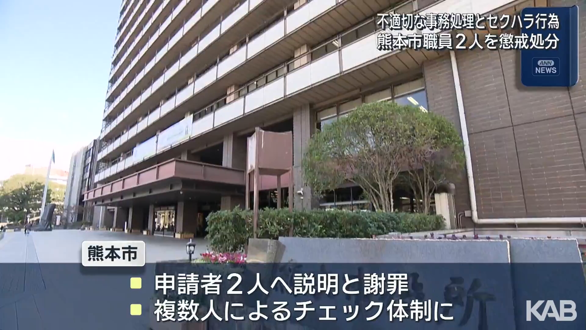 熊本市は、不適切な事務処理とセクハラ行為があったとして、男性職員2人を懲戒処分しました。 3カ月間の減給10分の1の処分を受けたのは、健康福祉局の男性主任主事(59)です。 男性は、重度障がい者が使用する電気式たん吸引機を給付するための、2人分の事務処理を...