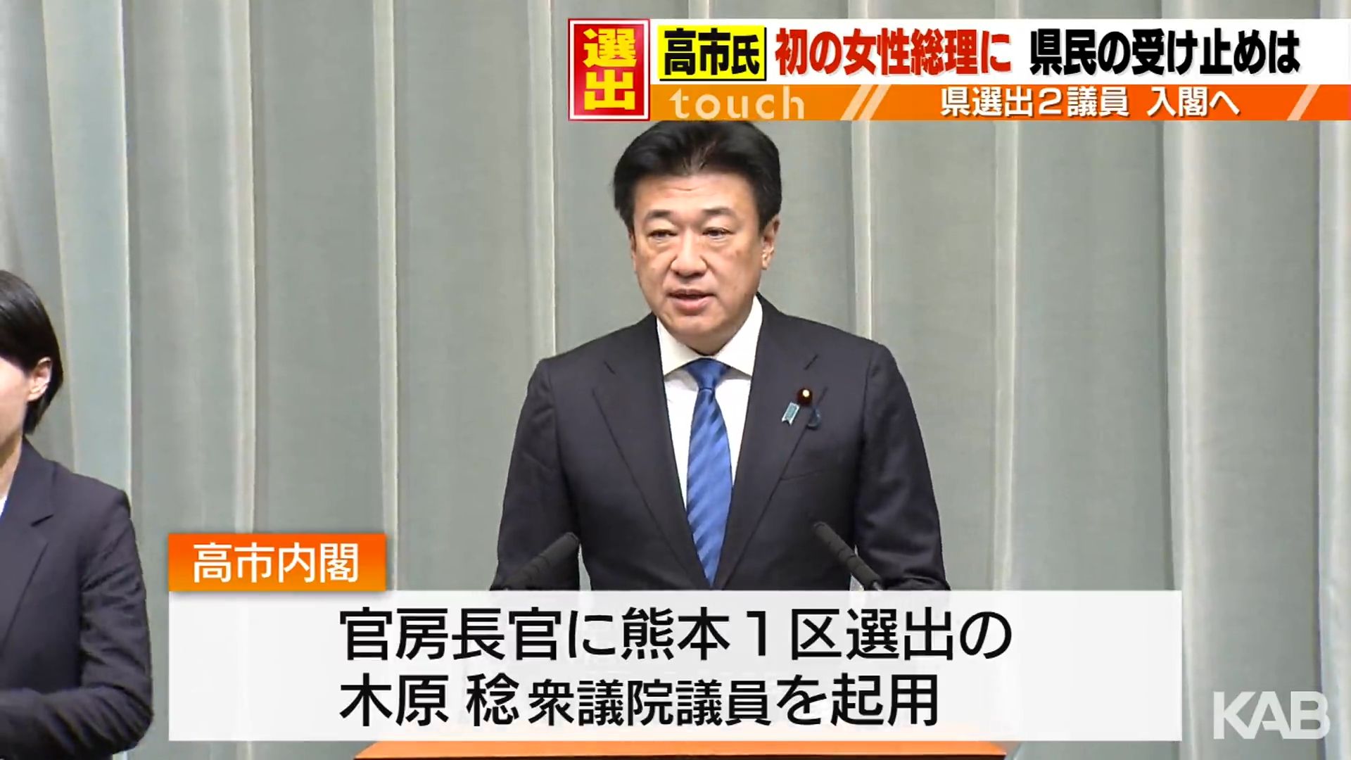 省庁間の調整を担う重要ポスト、官房長官に起用されるのは、熊本1区選出の木原稔衆議院議員。保守派のホープとして知られ、高市総理とも近い関係にあり、手腕が注目されます。