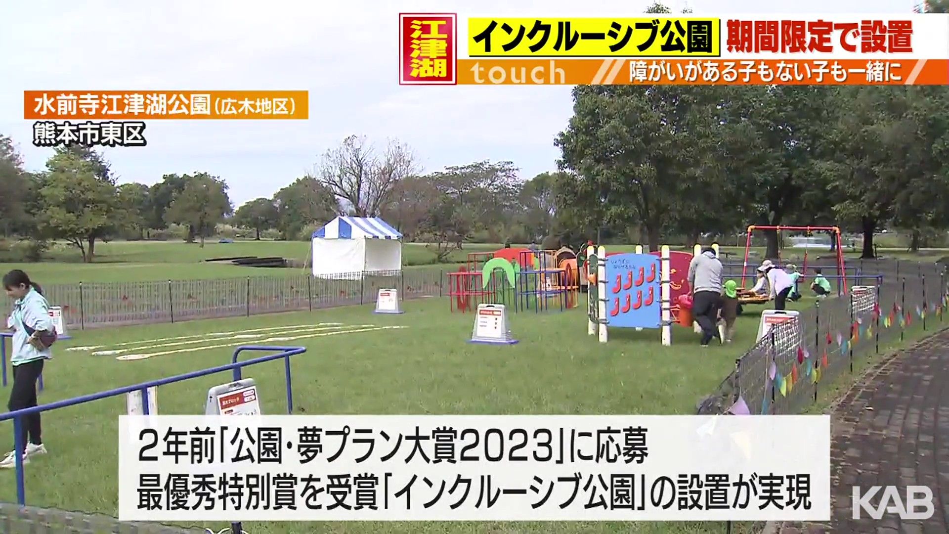 22日から27日までの期間限定で熊本市の水前寺江津湖公園に設置されている「障がいのある子もない子も一緒に遊べるひろば」。運動が苦手、ルールを理解することが難しいなど障がいのある子どもたちでも楽しめる遊具が設置された「インクルーシブ公園」です。