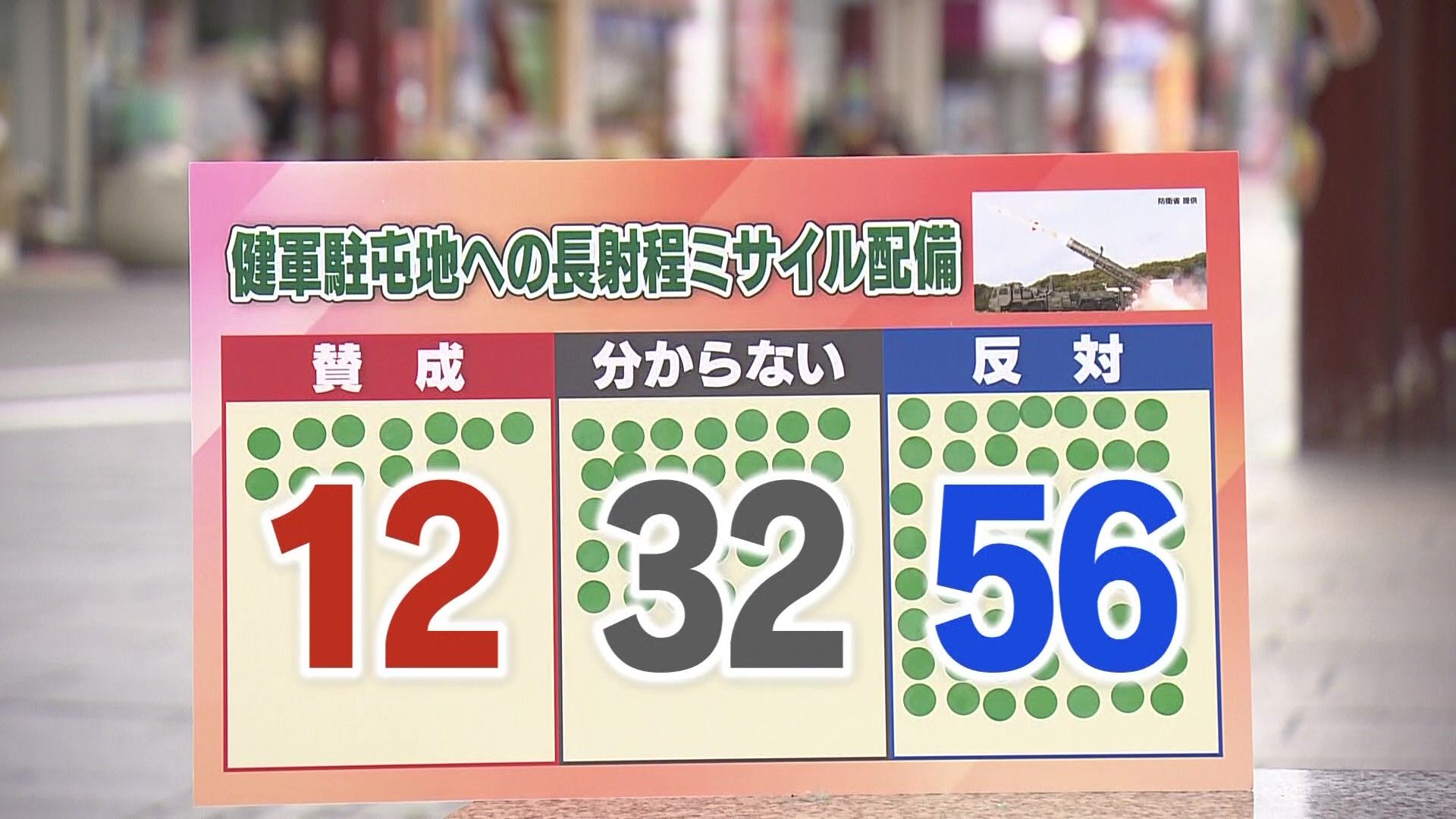 ミサイル配備について、健軍商店街で100人に聞いたところ、賛成は12人、分からないが32人、反対が56人という結果でした。