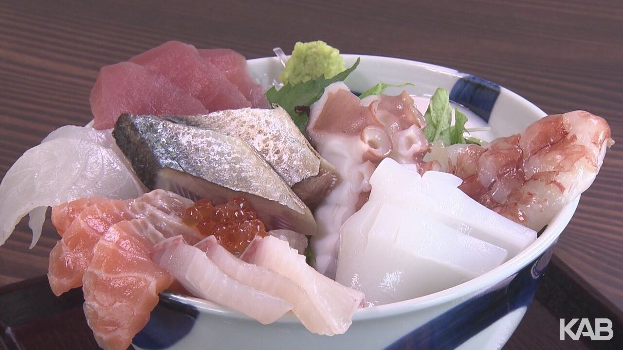もう一品は海鮮丼。マグロ、サーモン、タイやカンパチなど、どんぶりからはみ出すほどの季節の魚がのっています。中央には、旬のサンマが存在感を放っています。