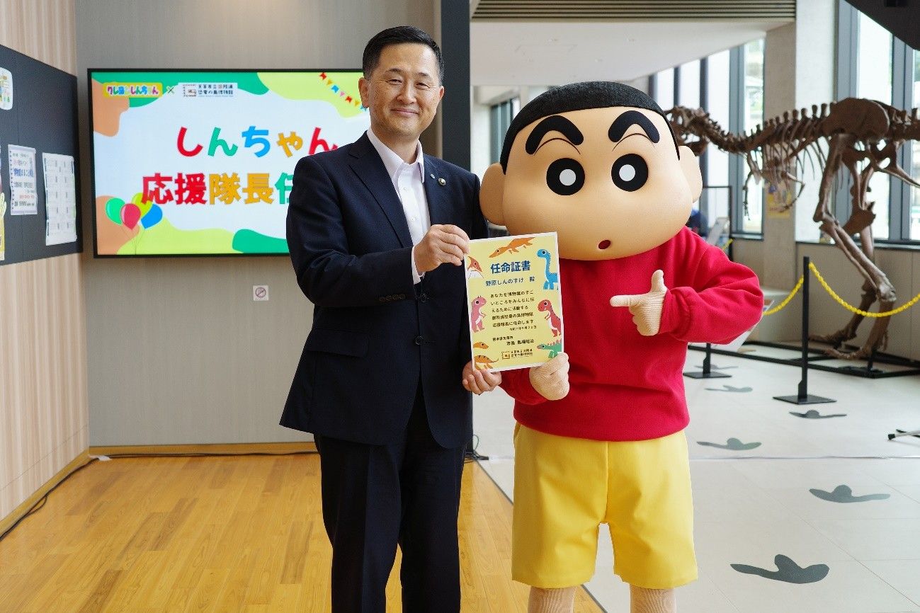 天草で発見された貴重な恐竜の化石など2000点を展示している天草市の御所浦恐竜の島博物館。応援隊長に、人気アニメ「クレヨンしんちゃん」の主人公・野原しんのすけくんが、博物館の応援隊長に就任しました。