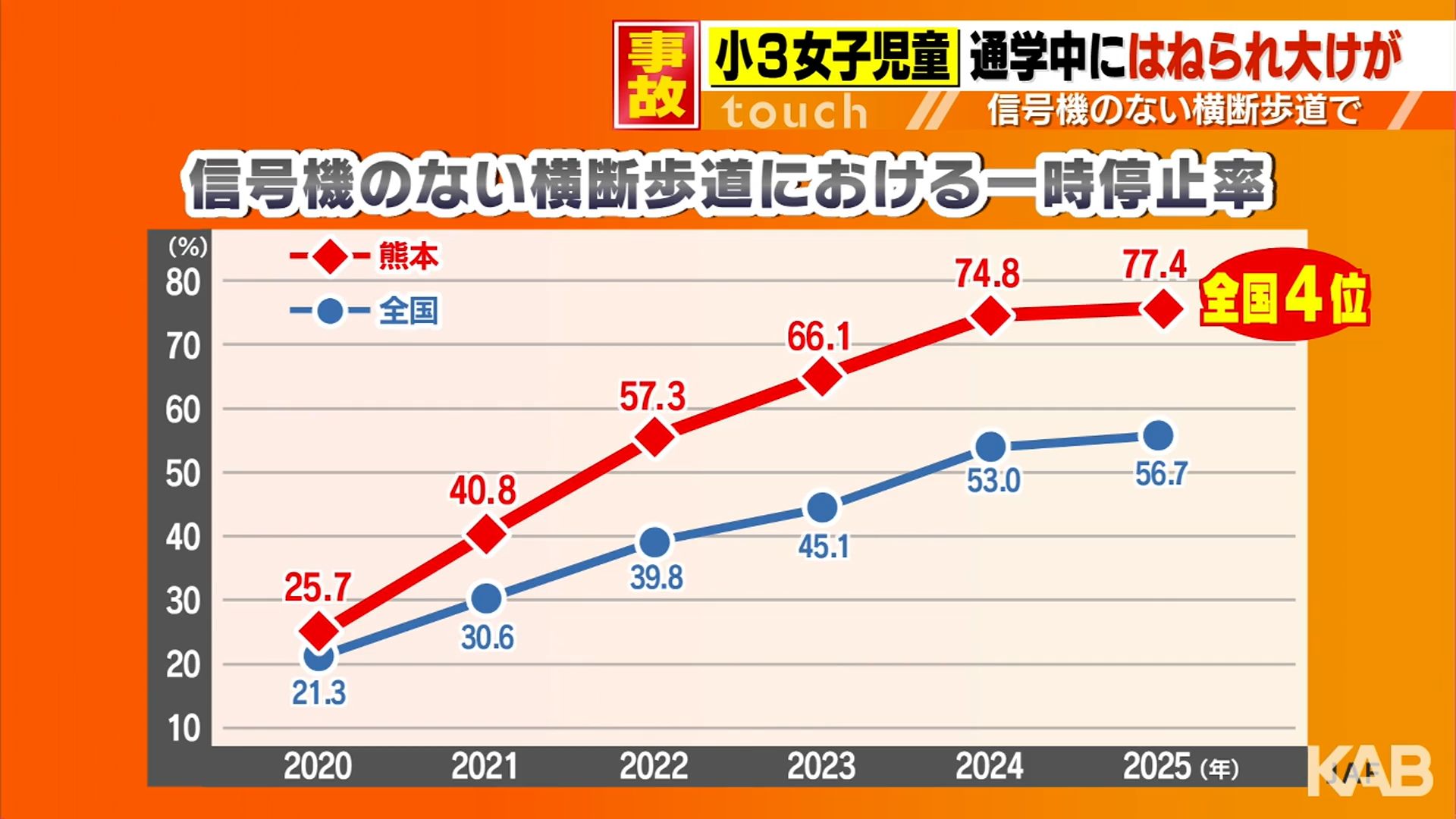 年々に改善傾向にあり、熊本県内は、全国平均を上回る77.4パーセントと、全国で4番目に高い結果となっていますが、道路横断中の事故は後を絶ちません。