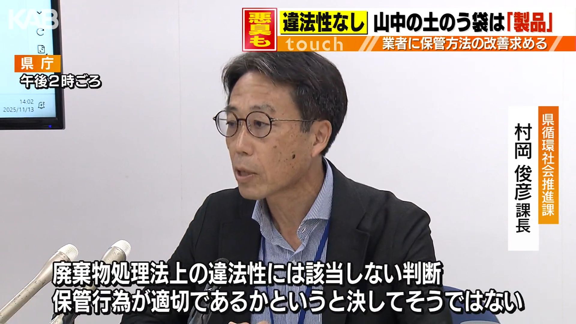 この問題は水俣市の廃棄物処理業者「吉永商会」が保管していた土のう袋から発生する悪臭や汚水をめぐるもので、県は13日に会見を開き、現地での調査などから土のう袋の中身が下水汚泥などを回収し発酵させた「たい肥」で、海外に輸出するため保管されていた「製品」だと説明。廃棄物には該当せず「法的な問題はない」と発表しました。
