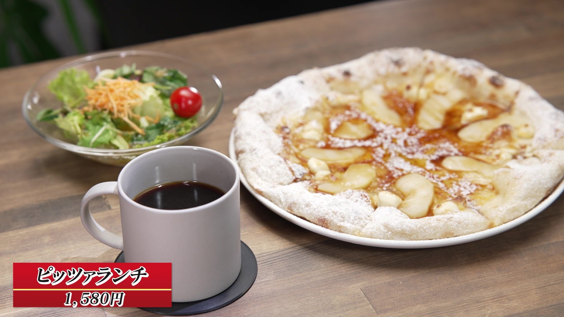 マボーノは、ピザとパスタとスイーツが楽しめるコーヒー店。この日のおすすめは、焼きリンゴとクリームチーズのピッツァ。自家製の生地は、モチモチ感を出すために水分値を高めに作っています。ミックスチーズ、チェダーチーズ、そしてリンゴをトッピングすれば完成です。リンゴの酸味とチーズのコラボレーションがたまらない一皿です。