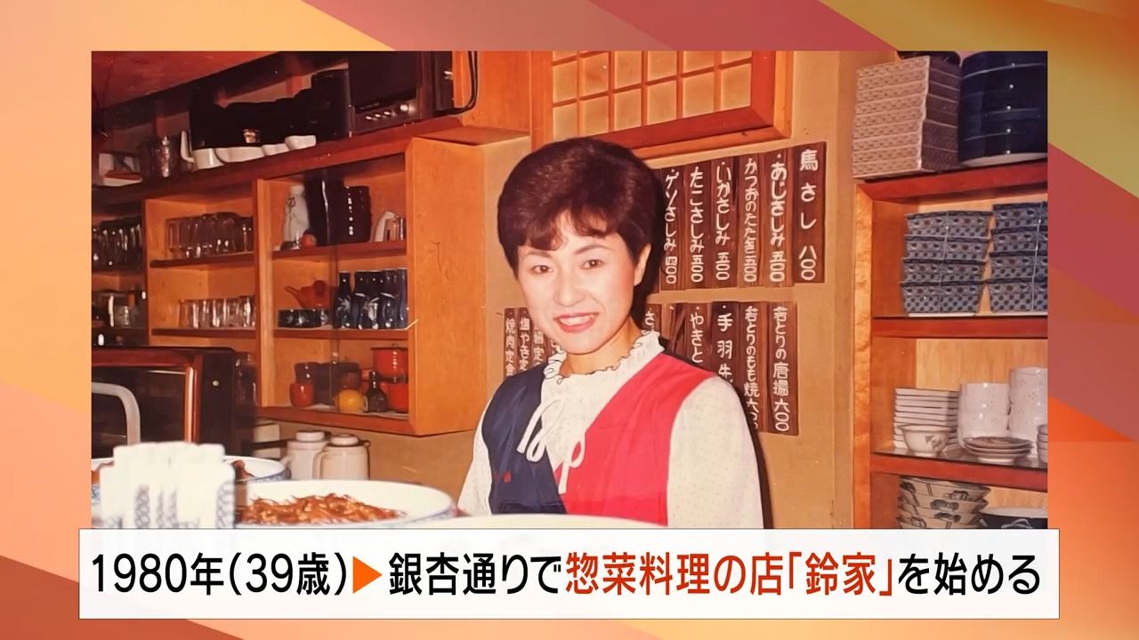 女将の松岡靖子さん。主婦だった39歳の頃、「自分の料理をみんなに食べてもらいたい」という夢を持ち、銀杏通りで総菜料理のお店を始めました。
