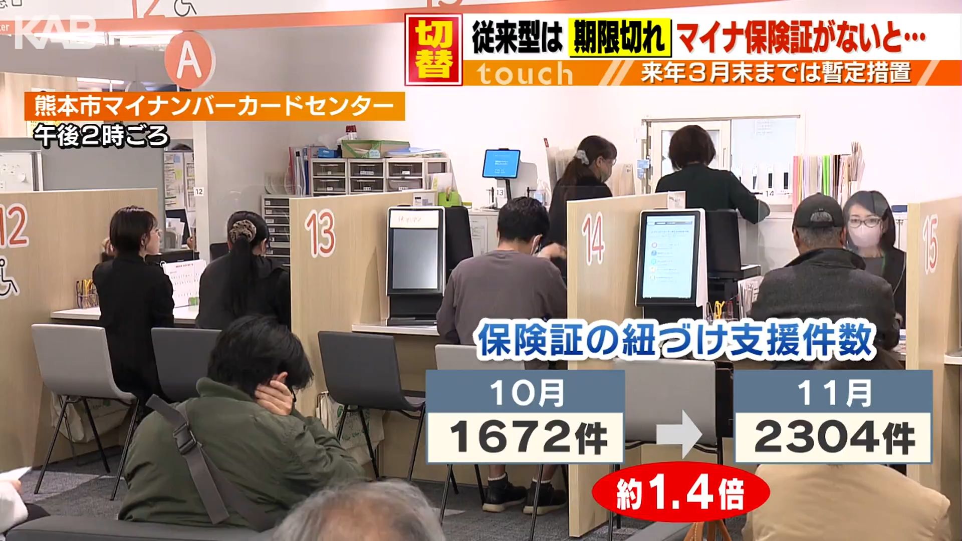 熊本市によると、市が先月保険証の紐づけを支援した件数は、前の月に比べ1.4倍になるなど、駆け込みでマイナ保険証に切り替える人が多い状況です。