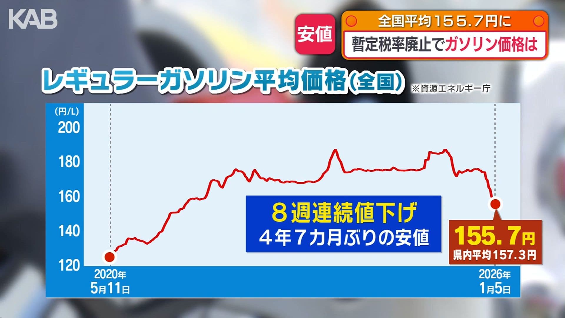 ガソリン価格8週連続値下がり4年7カ月ぶりの水準 熊本では?