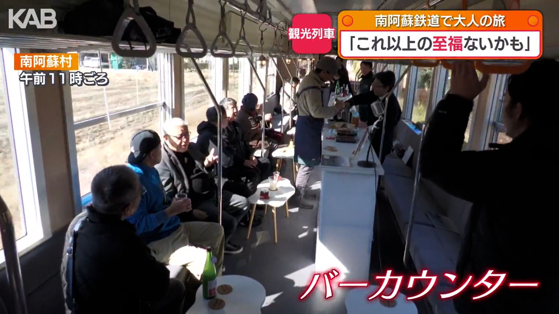 列車の通路には、バーカウンター。マスターは南阿蘇鉄道の社員です。列車に乗って、南阿蘇村の冬景色を楽しんでもらいたいと、南阿蘇鉄道が企画しました。