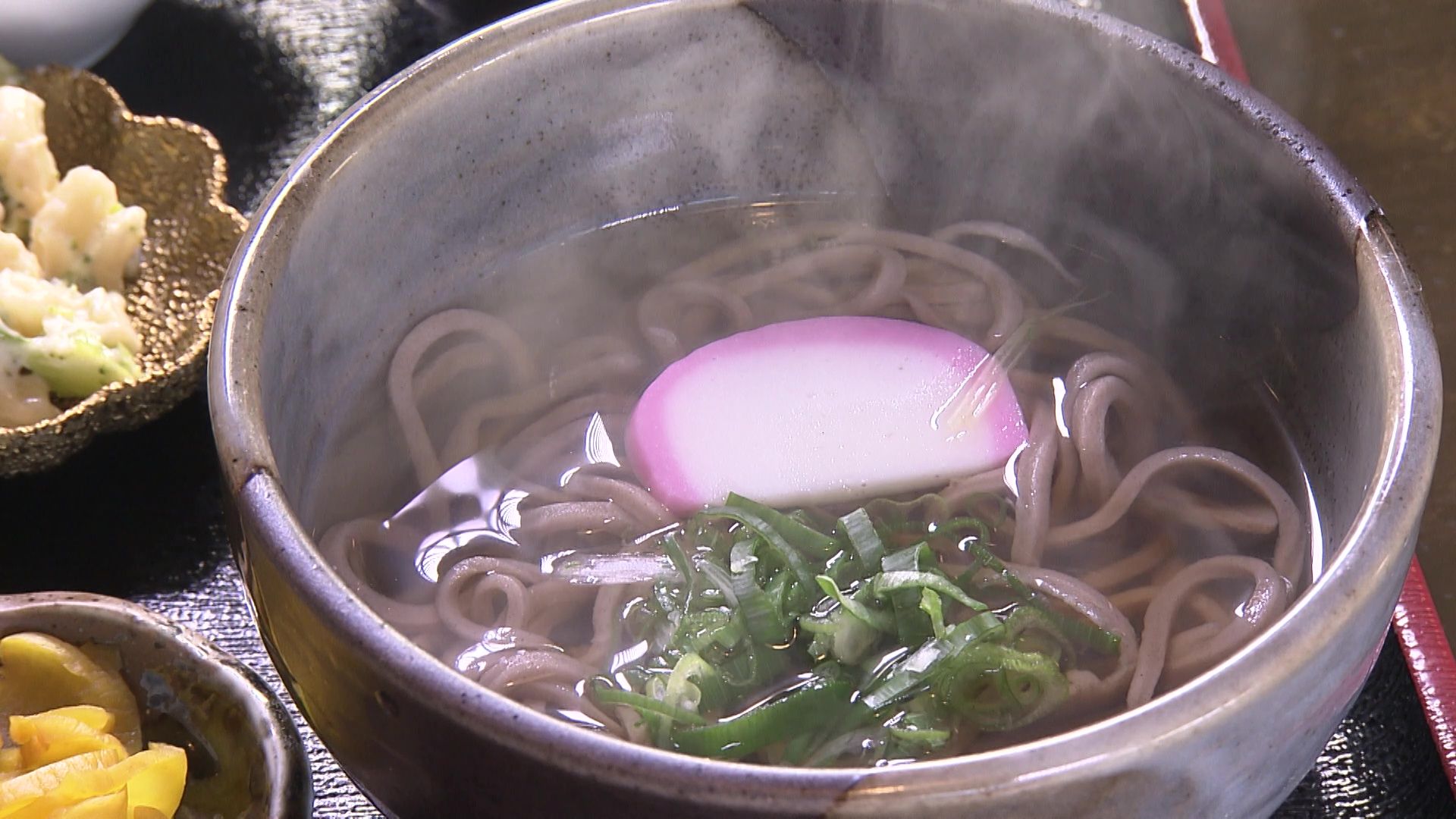 麺は、うどんとそばから選ぶことができます。自家製うどんは太めでコシがあります。そばは田舎風の太麺で、こちらも食べ応え満点です。