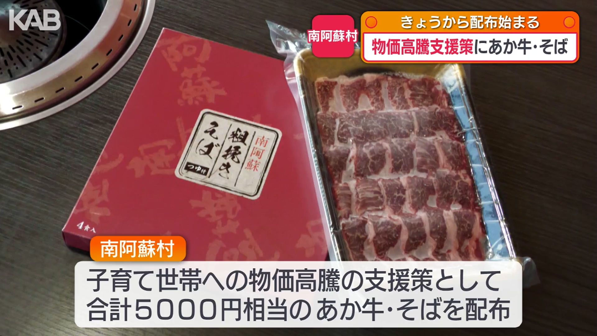 熊本県南阿蘇村では子育て世帯への物価高騰の支援策として、5000円相当のあか牛とそばの配布が始まりました。
