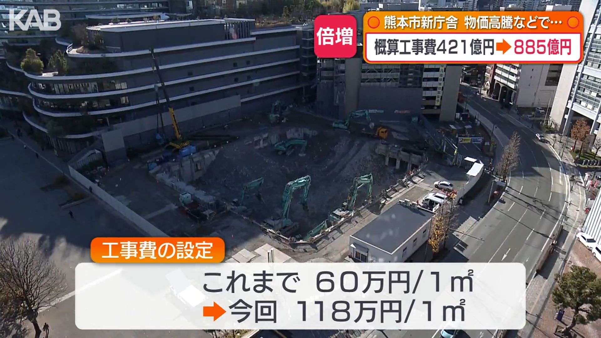 熊本市役所の新庁舎の概算工事費が421億円から885億円に。工事費の高騰などを理由に2倍以上の額となる試算が、22日の市議会特別委員会で説明されました。