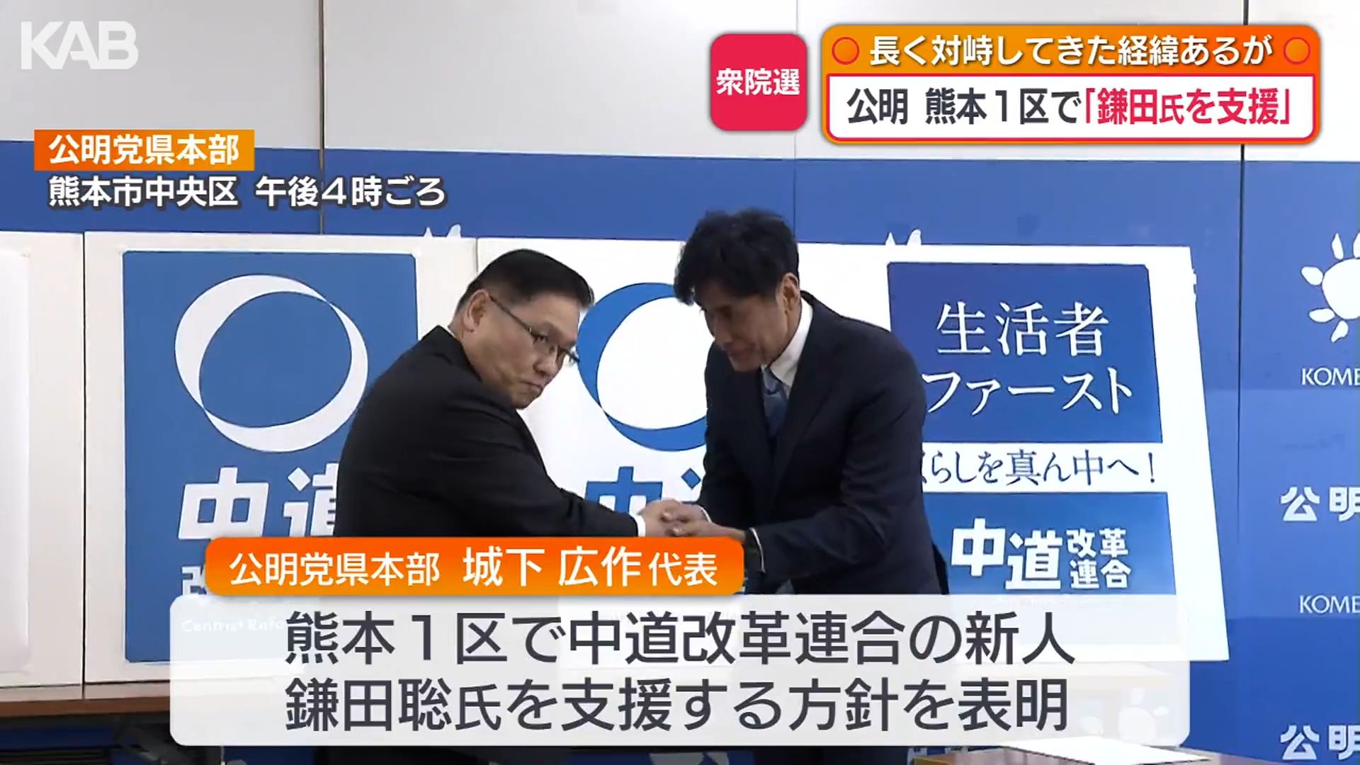 公明党県本部の城下広作代表は、熊本1区で中道改革連合の新人、鎌田さんを支援する考えを示しました。