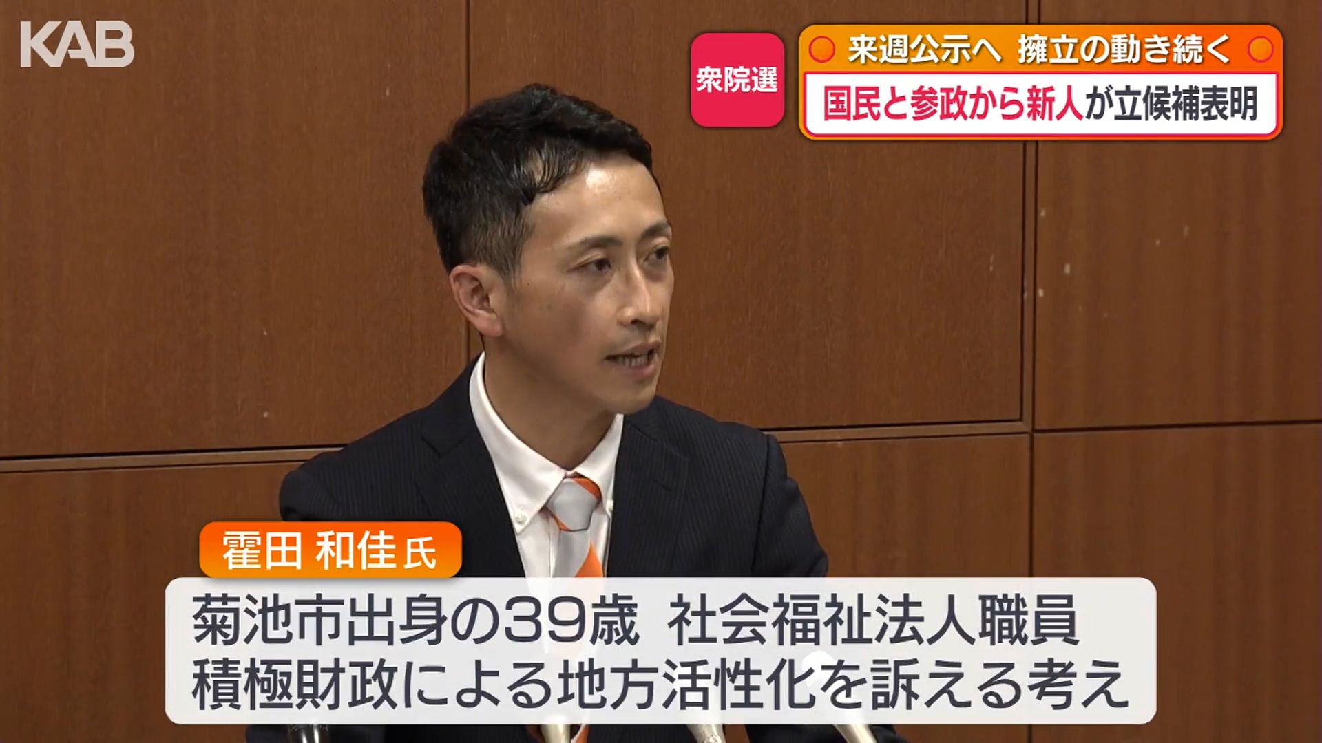 霍田さんは菊池市出身の39歳。選挙戦では積極財政による地方活性化を訴える考えです。
