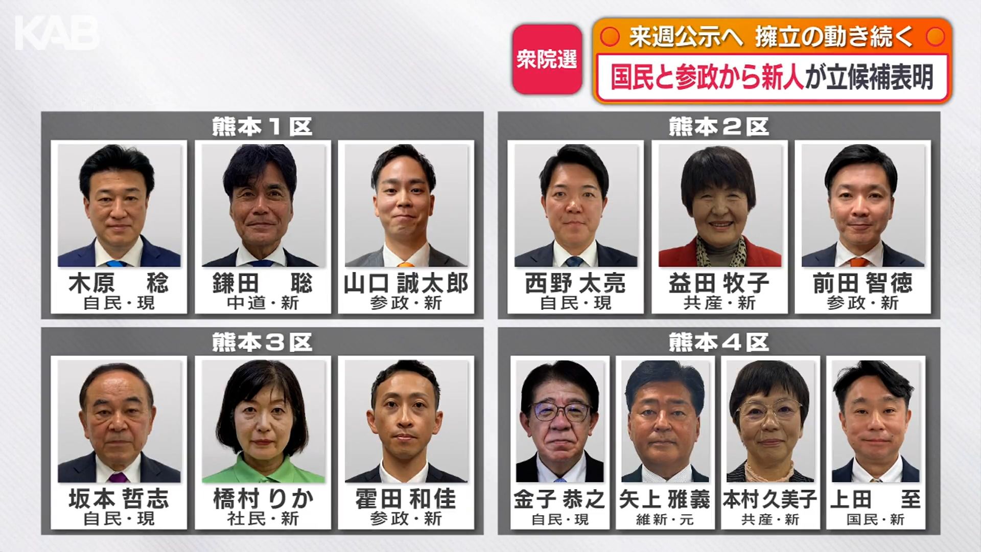 衆院選は現在、熊本1区に3人、熊本2区に3人、熊本3区に3人、熊本4区に4人が出馬の意向を示しています。