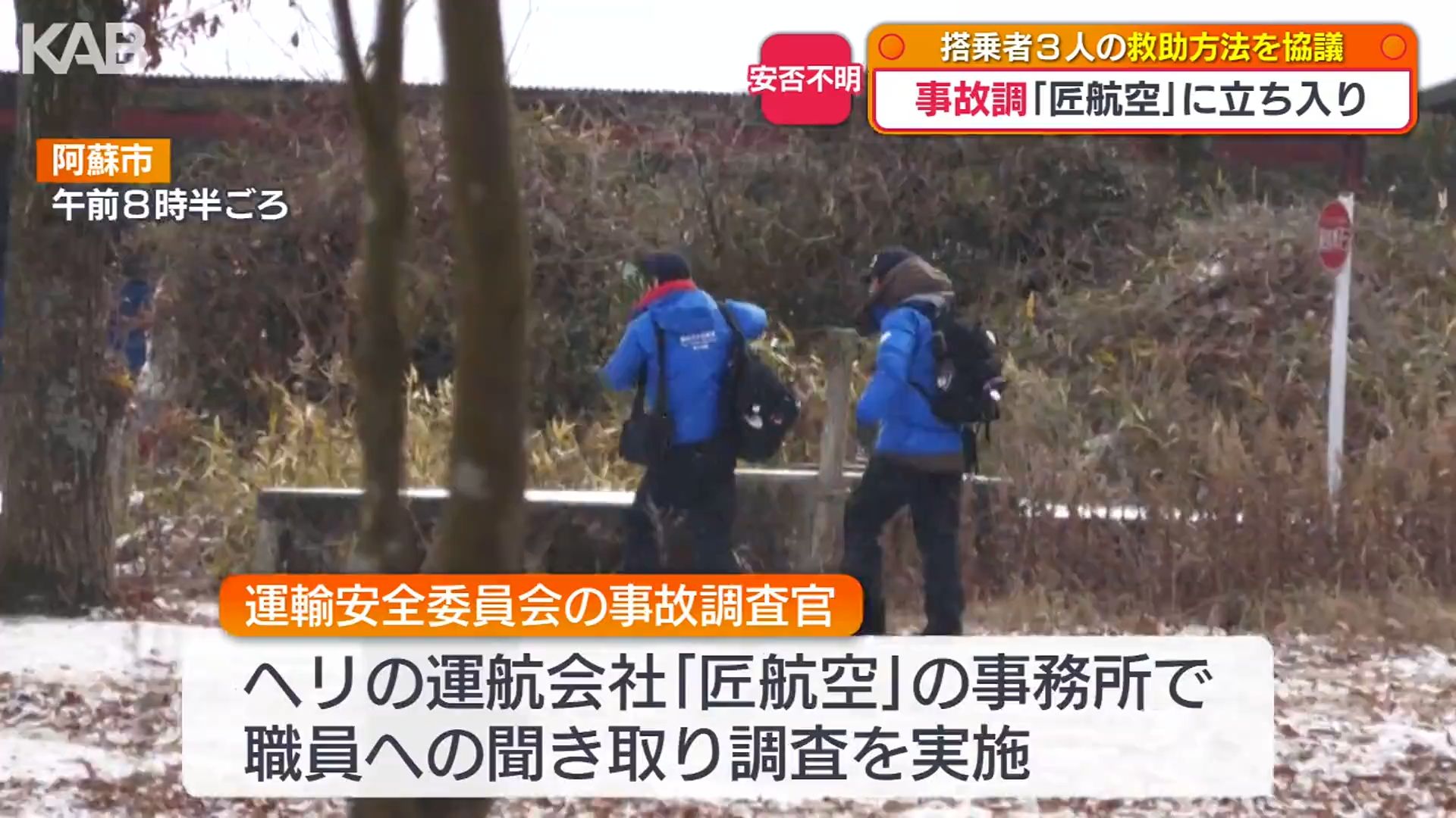 23日8時半ごろ、運輸安全委員会の事故調査官2人が、阿蘇市にある墜落したヘリの運航会社「匠航空」の事務所に調査に入り、22日に続いて、職員への聞き取り調査を実施。
