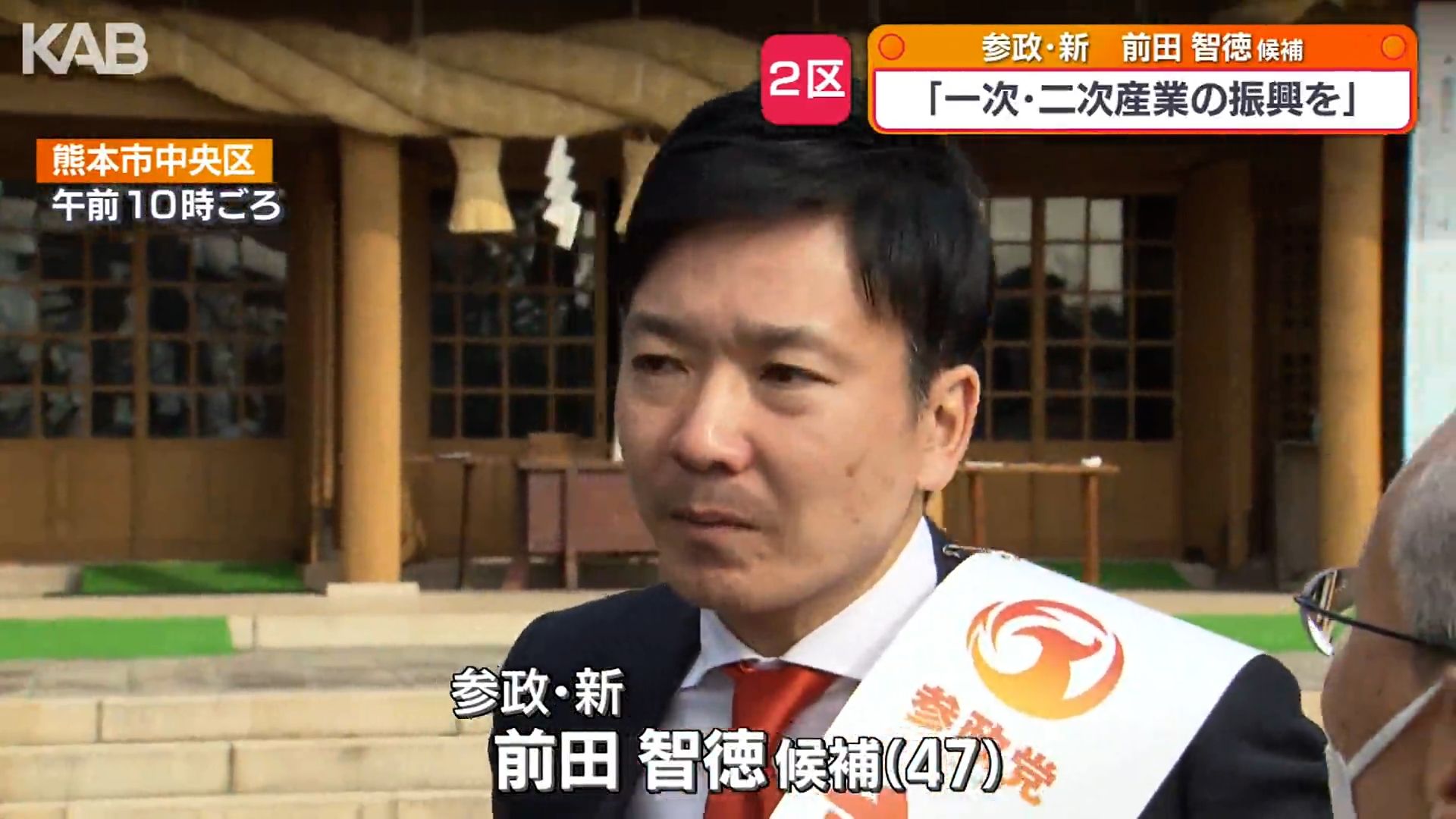 参政党・新人の前田智徳候補は、熊本市中央区の神社で祈願を終え、JR上熊本駅前で第一声をあげました。