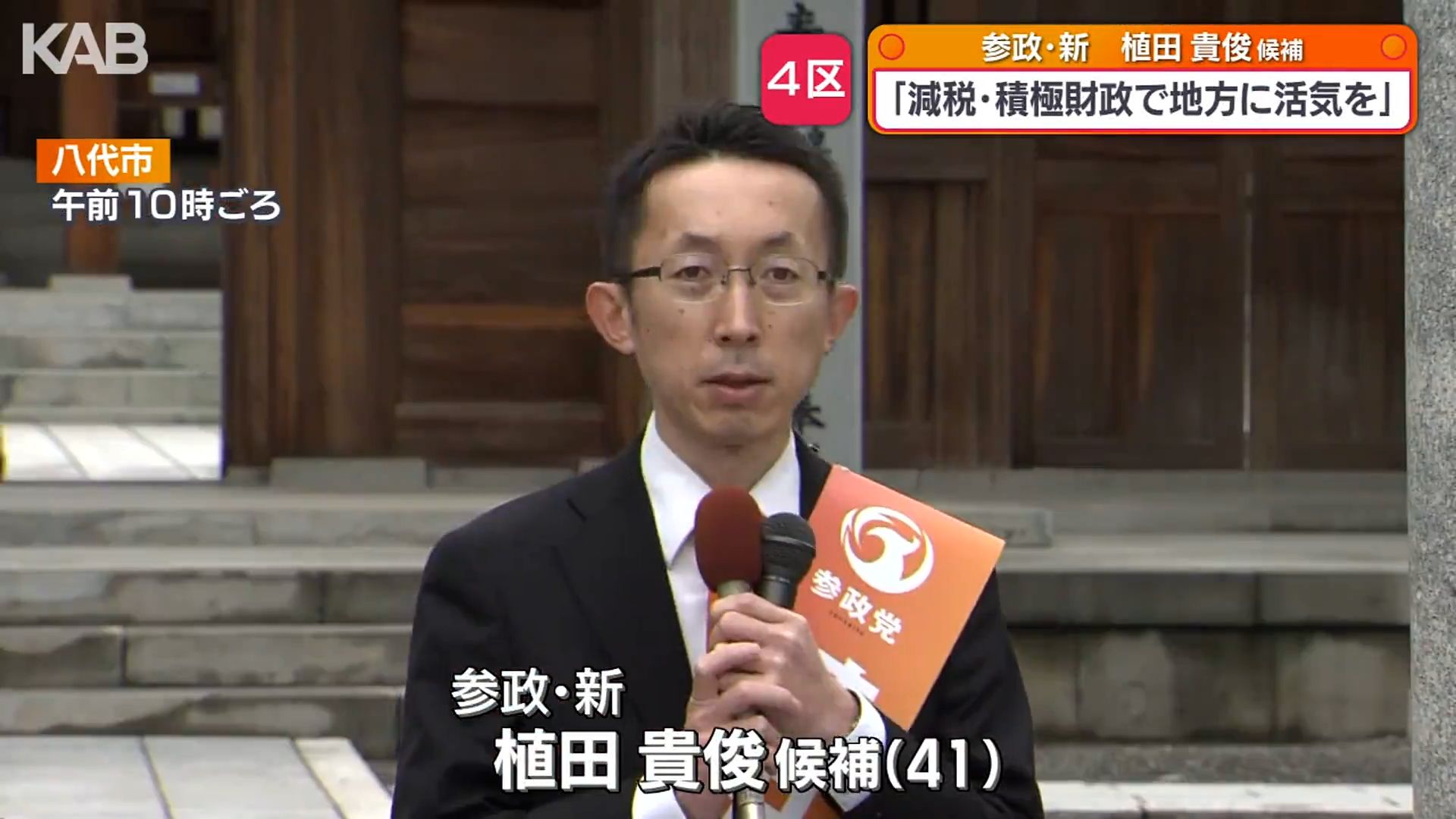 参政党・新人の植田貴俊候補は、八代市にある神社で第一声を上げました。幼少期を八代市で過ごした経験に触れ、地域活性化の重要性を訴えました。
