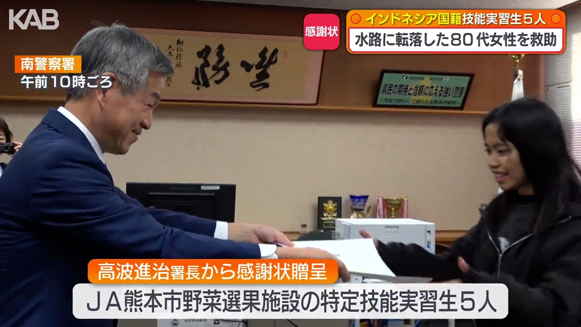 水路に転落した女性を救助 技能実習生ら5人に感謝状