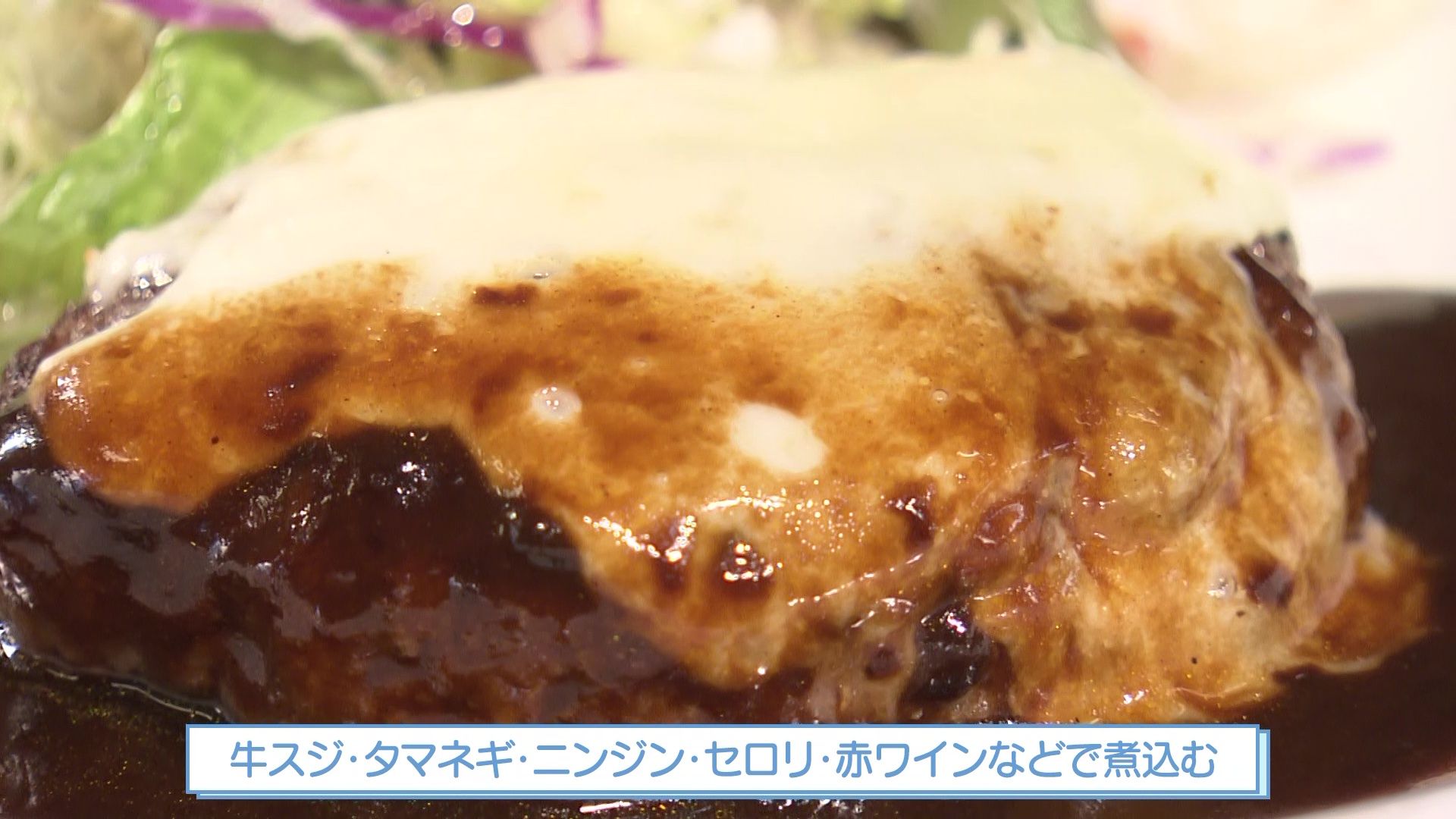 仕上げのデミグラスソースは、牛スジ・タマネギ・ニンジン・セロリ・赤ワインなどでじっくり煮込んだ手の込んだソースです。これを贅沢にかけて、和牛の旨味とチーズが溶け合う絶品モッツァレラハンバーグの完成です。