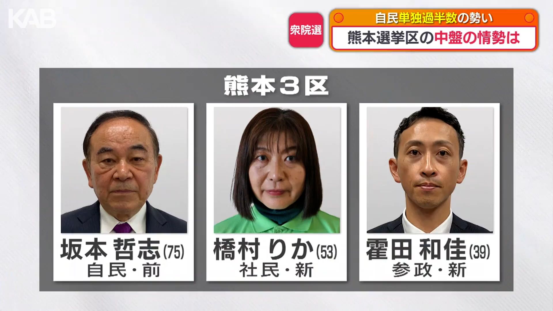 熊本3区は、自民党の坂本さんが優勢で参政党の霍田さん、社民党の橋村さんは厳しい戦いとなっています。