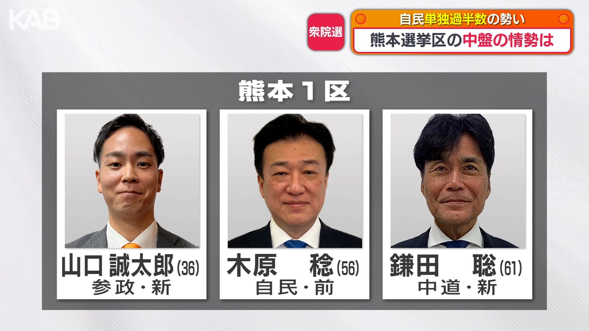 熊本1区は、自民党の木原さんが優位に立ち、中道改革連合の鎌田さんと参政党の山口さんは厳しい戦いとなっています。