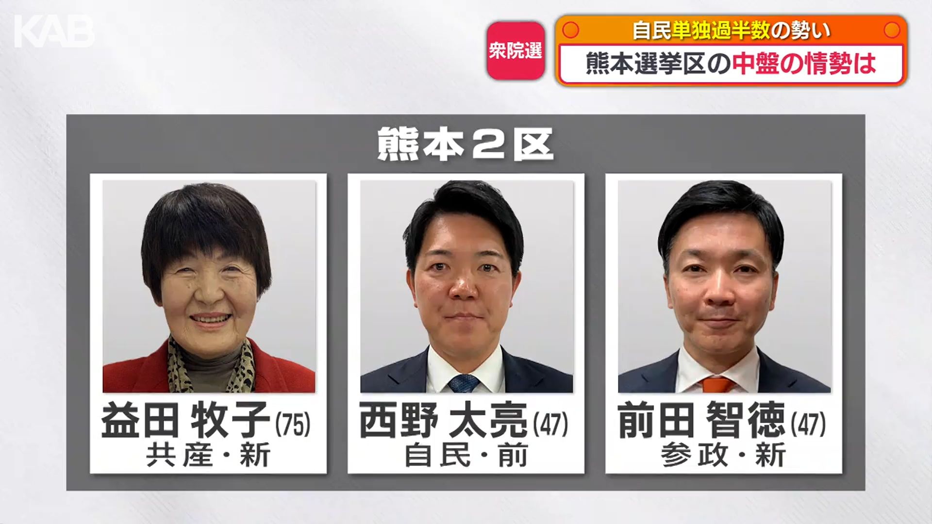 熊本2区は、自民党の西野さんがリードしていて、参政党の前田さん、共産党の益田さんは苦戦を強いられています。
