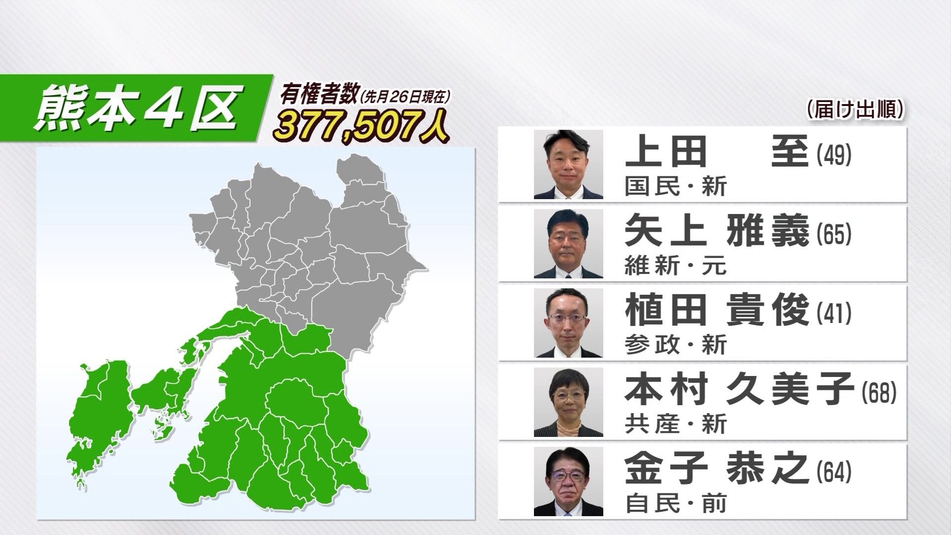 熊本4区もその一つ。八代市や人吉市、天草市などを含む日本有数の広大な選挙区で、自民党の前職に、日本維新の会の元職、国民民主党、共産党、参政党の新人が挑みます。