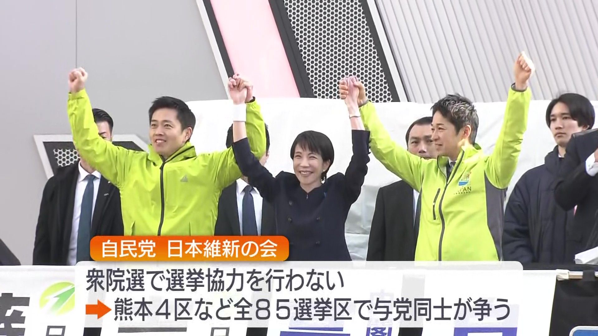連立の新たなパートナーとなった2党。選挙協力を行わないため、85選挙区で与党同士が激突する、異例の展開となっています。