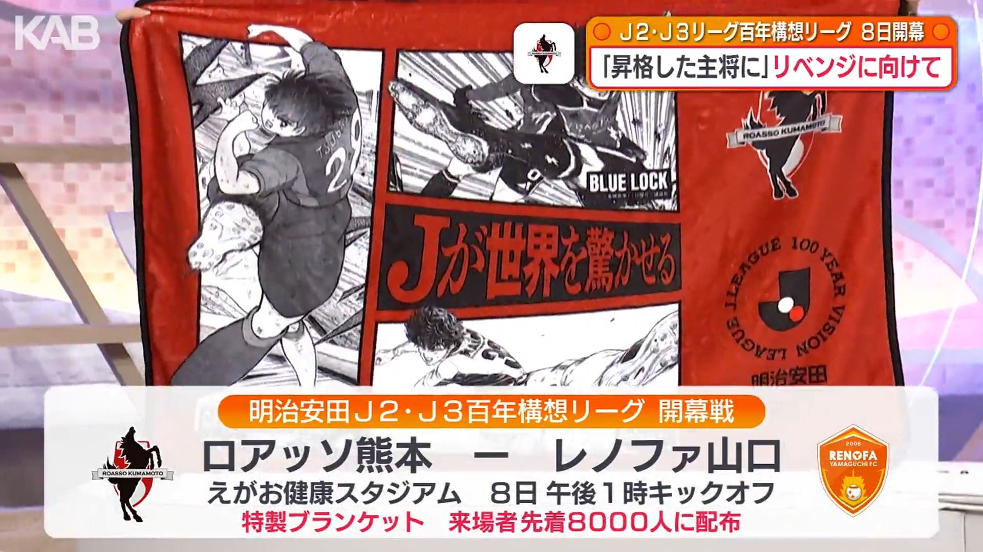 百年構想リーグ開幕戦は、熊本市のえがお健康スタジアムで、2月8日午後1時キックオフ。レノファ山口との対戦です。