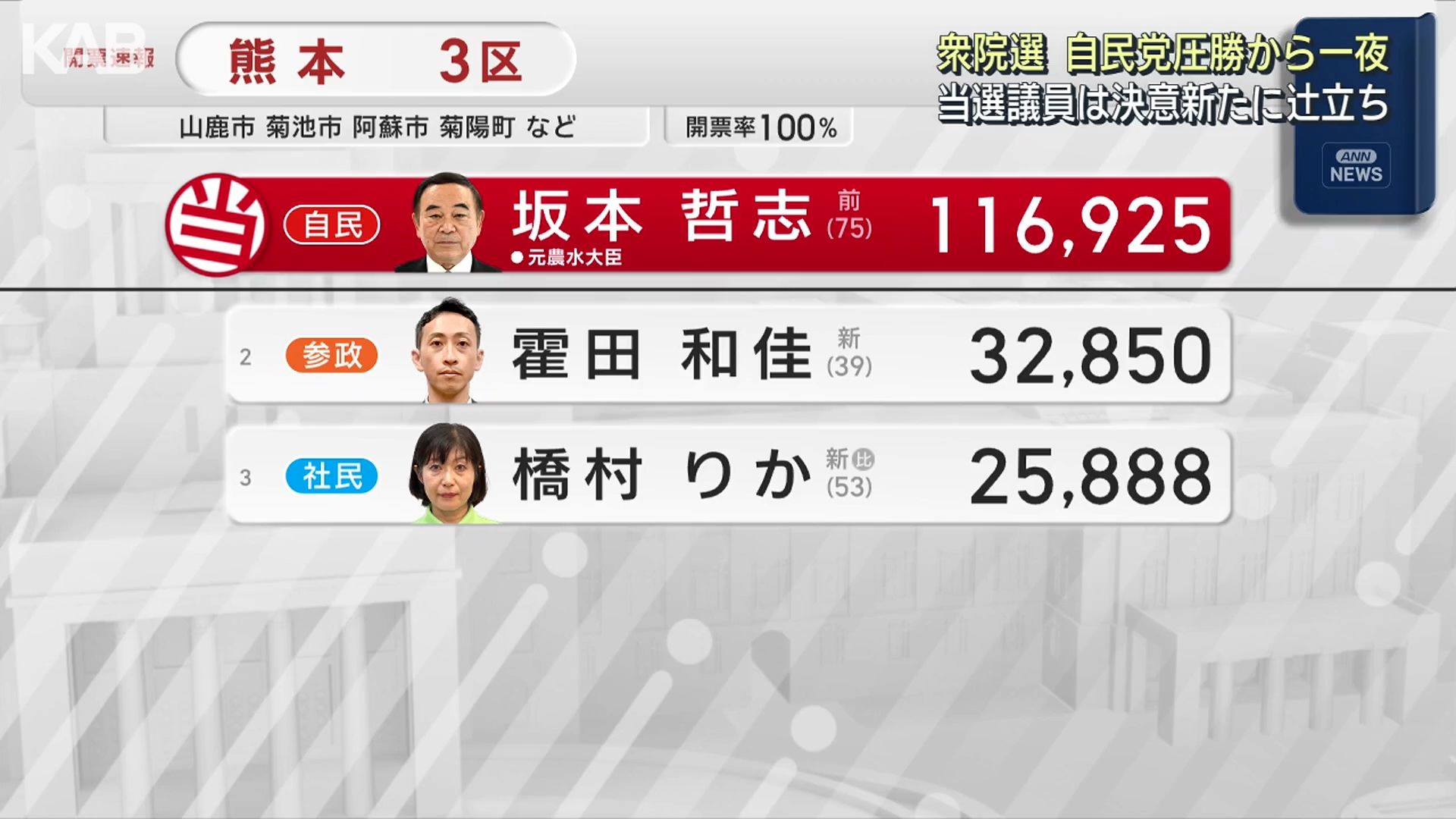 熊本3区は、坂本哲志さんが9回目の当選です。