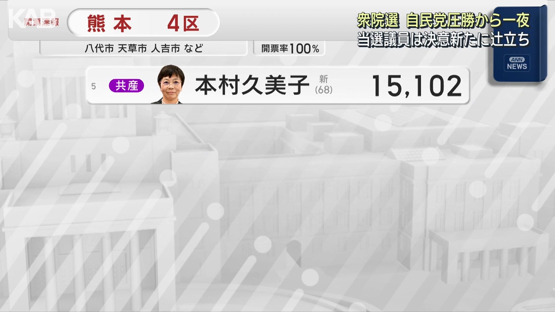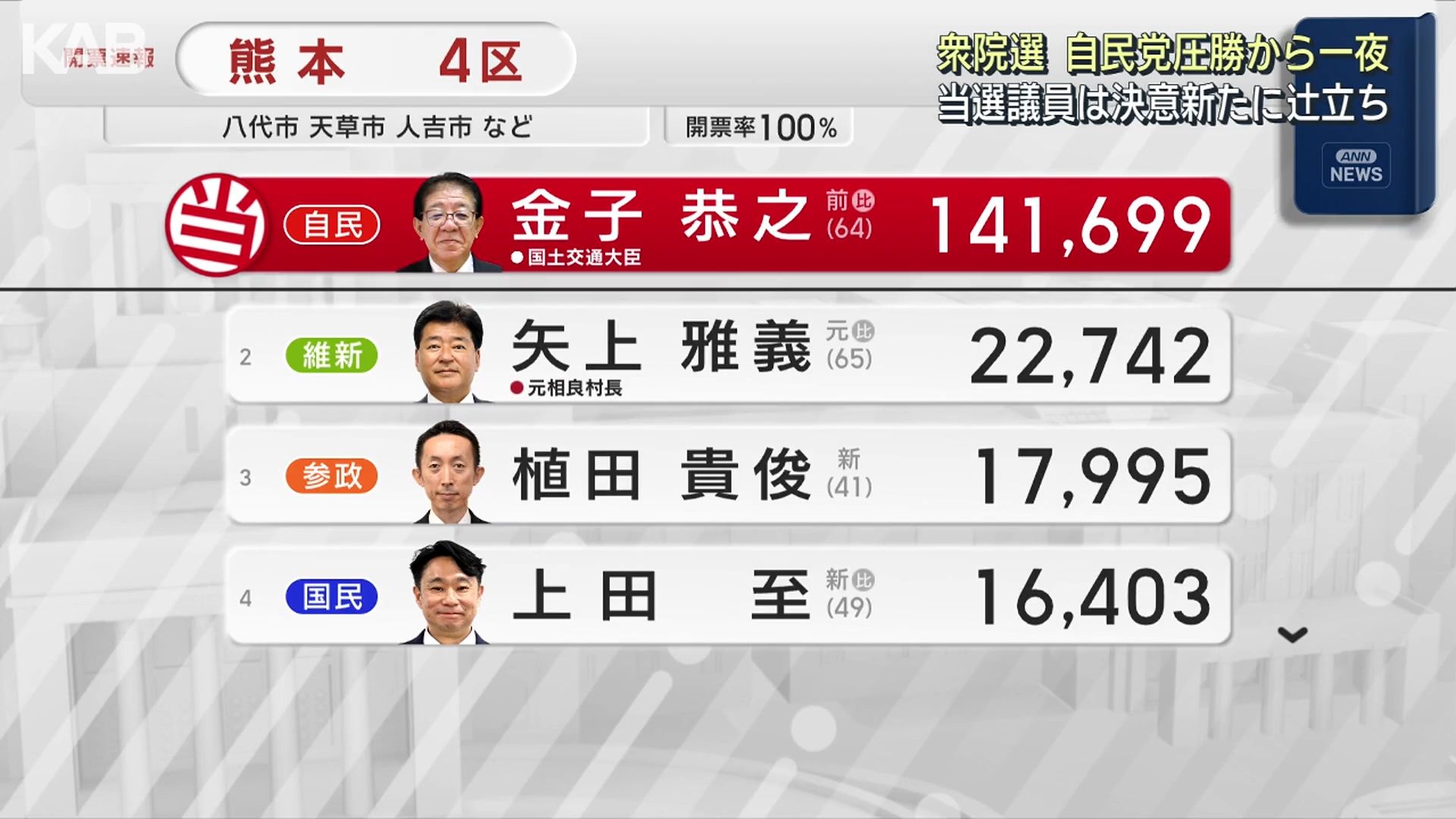 熊本4区は金子恭之さんが10回目の当選を果たしました。