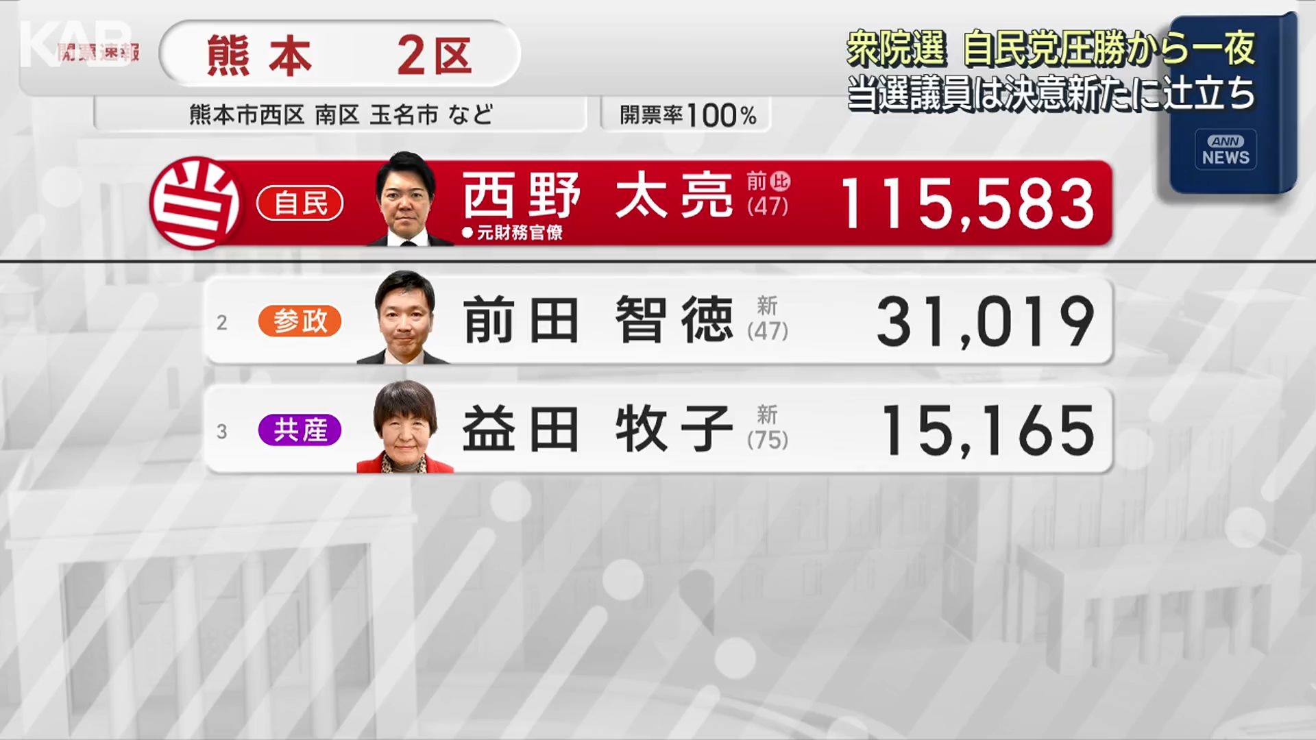 熊本1区の開票結果です。木原稔さんが当選しました。