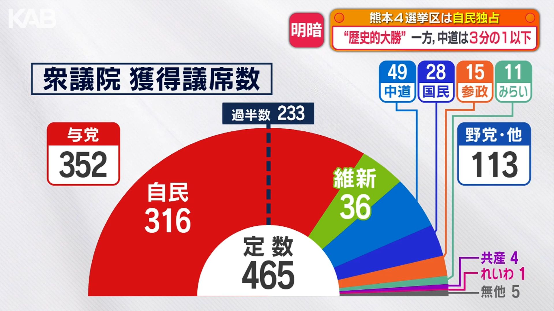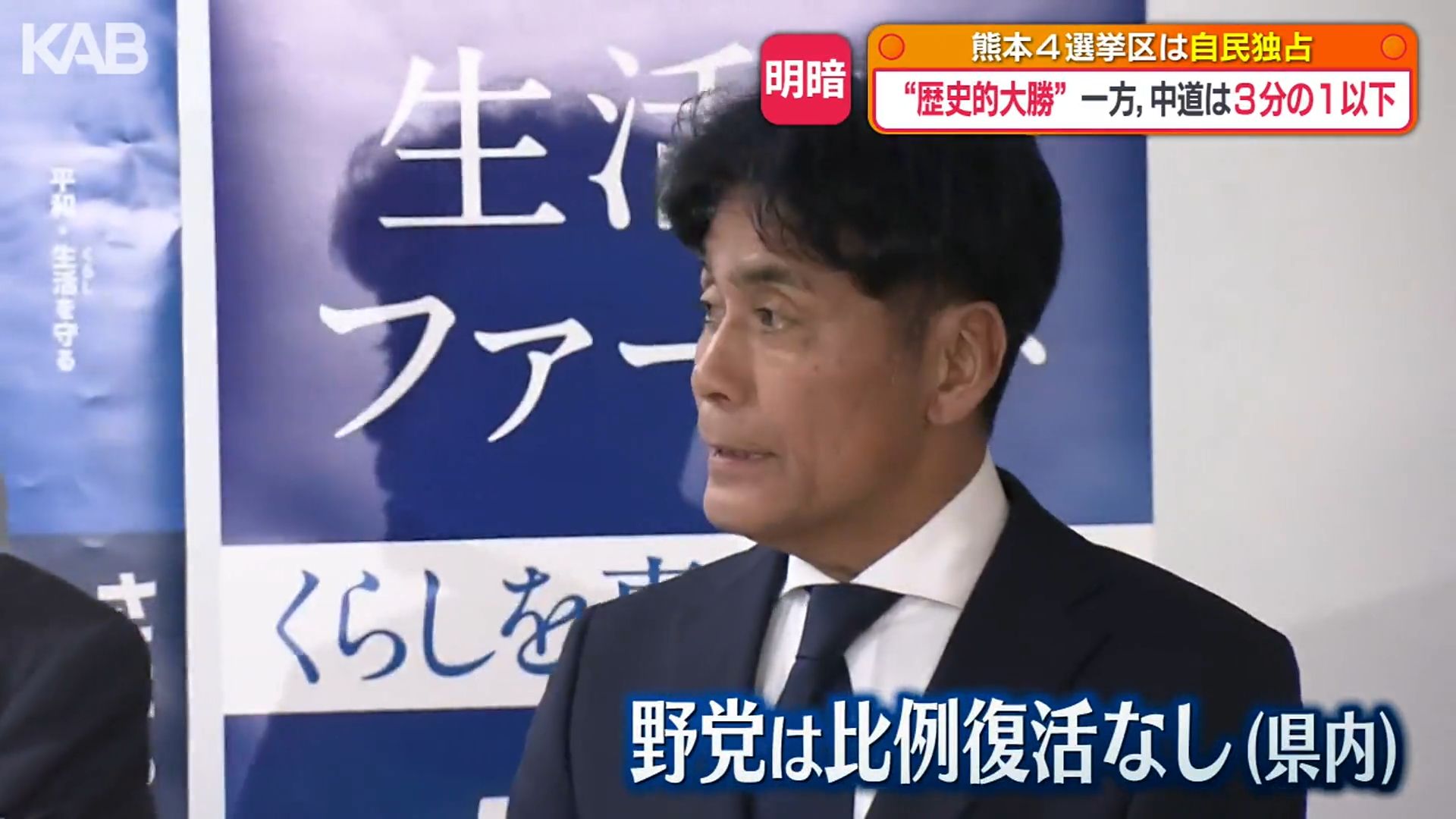 野党は比例復活もできず全敗。熊本県内全ての選挙区に候補者を立てた参政党も、去年の参院選と比べ比例票を4万票以上減らすなど県内では勢いに陰りが見られました。