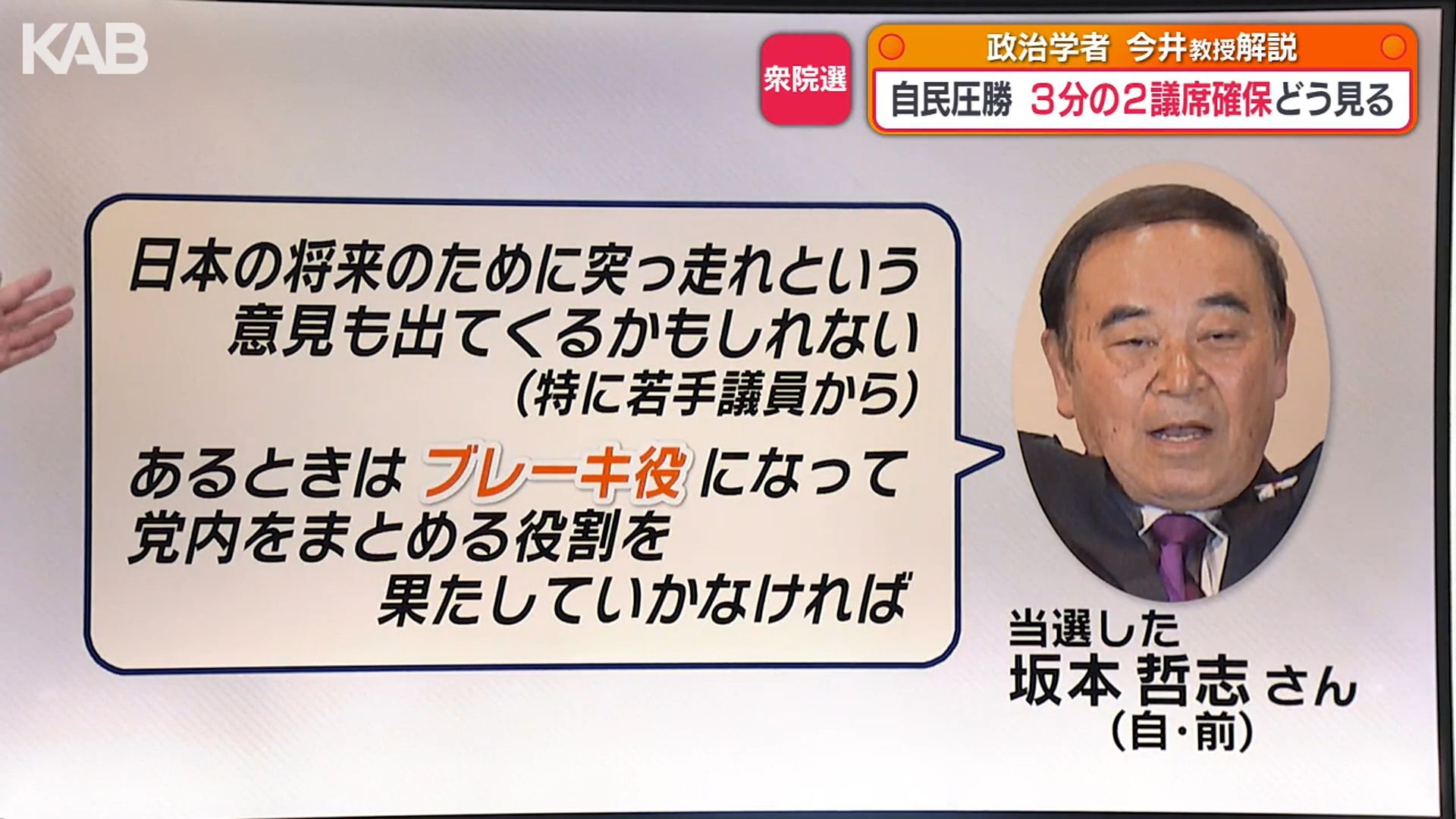 熊本3区で9回目の当選を果たした坂本哲志議員は「日本の将来のために突っ走れという意見も出てこないとは限らない。特に若い議員たちはそういう傾向が強いと思う。あるときはブレーキ役になって党内をまとめる役割を果たしていかなければならない」と語りました。