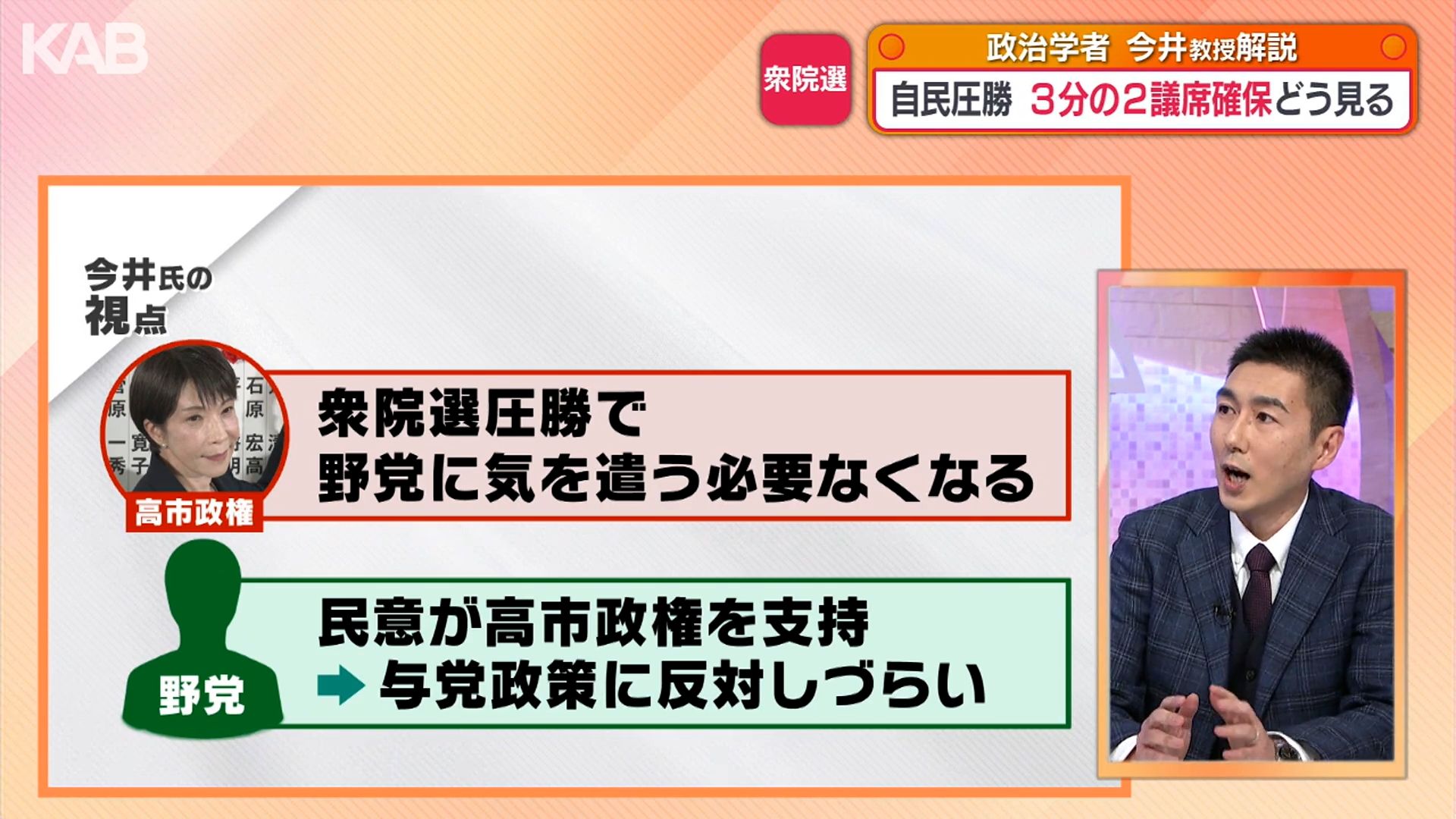 「本来、こうしたチェック機能は野党が果たすべきものですが、今回は「中道改革連合をはじめとして、野党が壊滅状態となってしまった。政権が進める政策が民意と乖離しているような状況になったときに、それに対して、野党がチェック機能を果たすのはなかなか難しい」と今井教授は指摘します。