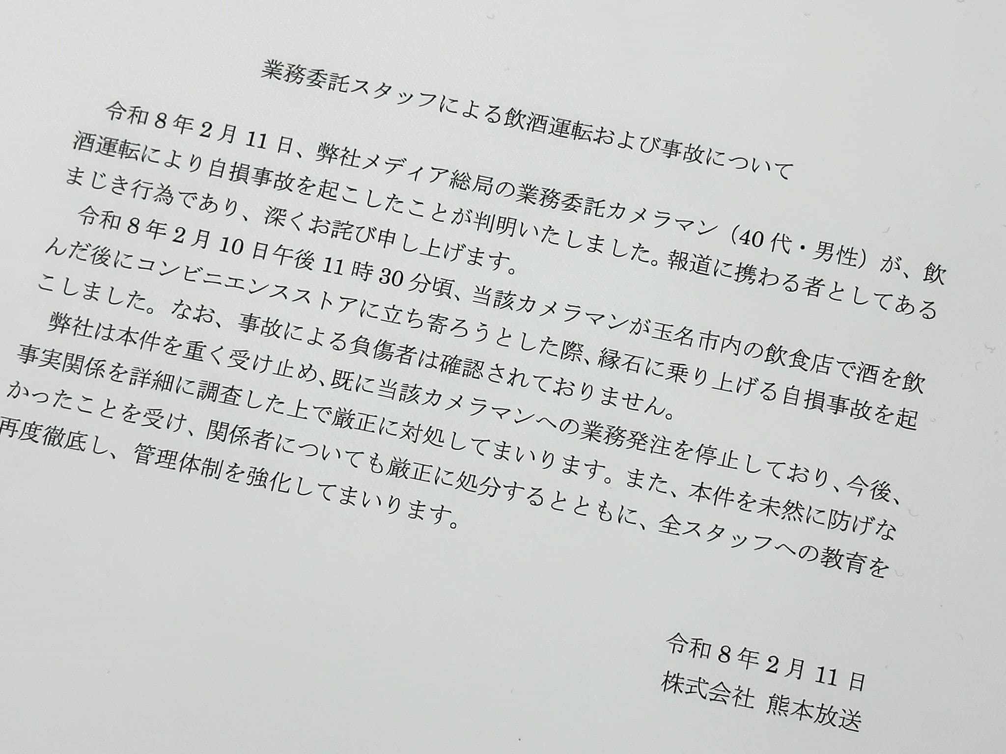 RKK業務委託カメラマンが飲酒運転で自損事故「深くお詫び」