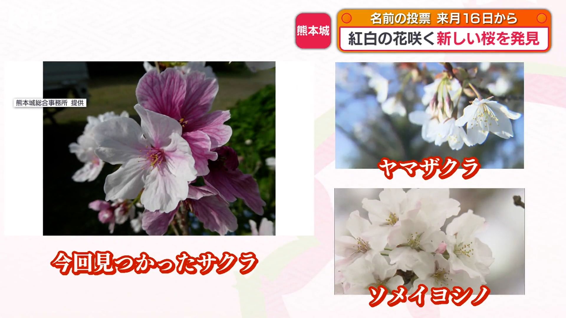 この桜に名前を付け守り育てるため、熊本城にちなんだ①二様②八十姫③援結④むぞか⑤二の丸、5つの候補が提案されています。
