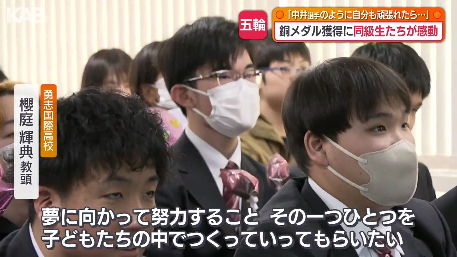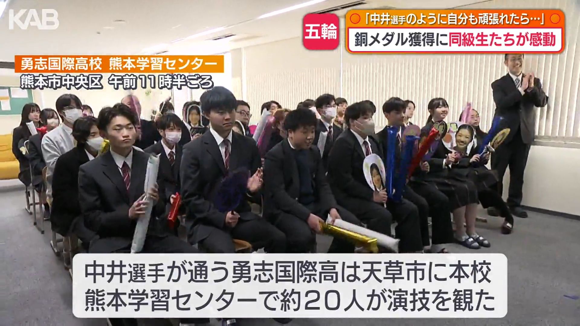 中井選手が通う通信制の勇志国際高校は、天草市が本校で、20日は熊本市にある学習センターで、生徒たち約20人が勇姿を見つめ、大きな刺激をもらっていました。